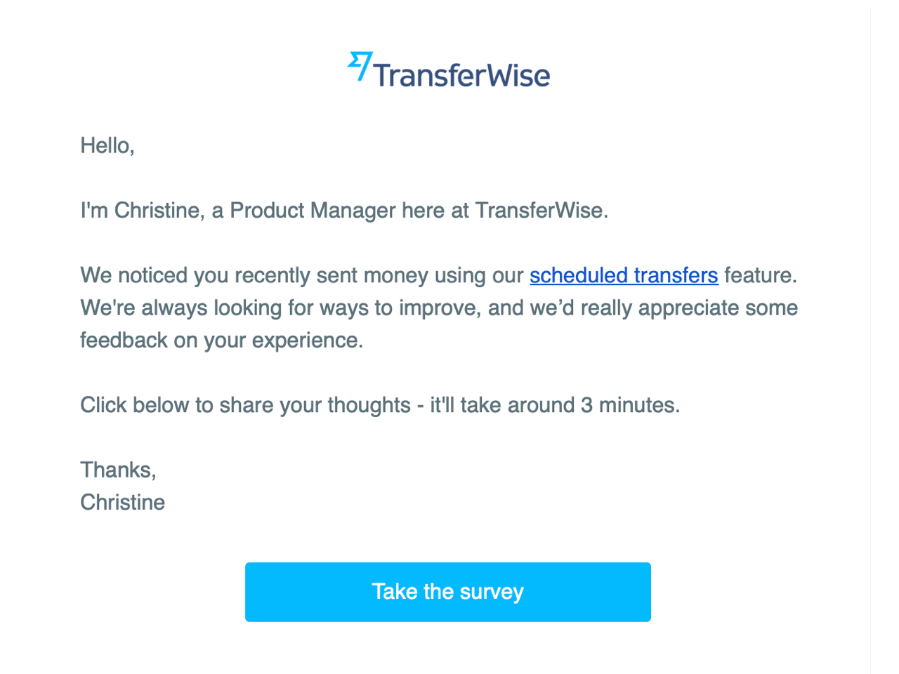 Another way to show your audience that you value them is by sending them more relevant surveys instead of treating them like just another data point. For example, TransferWise sends surveys based on the specific features you actually use.