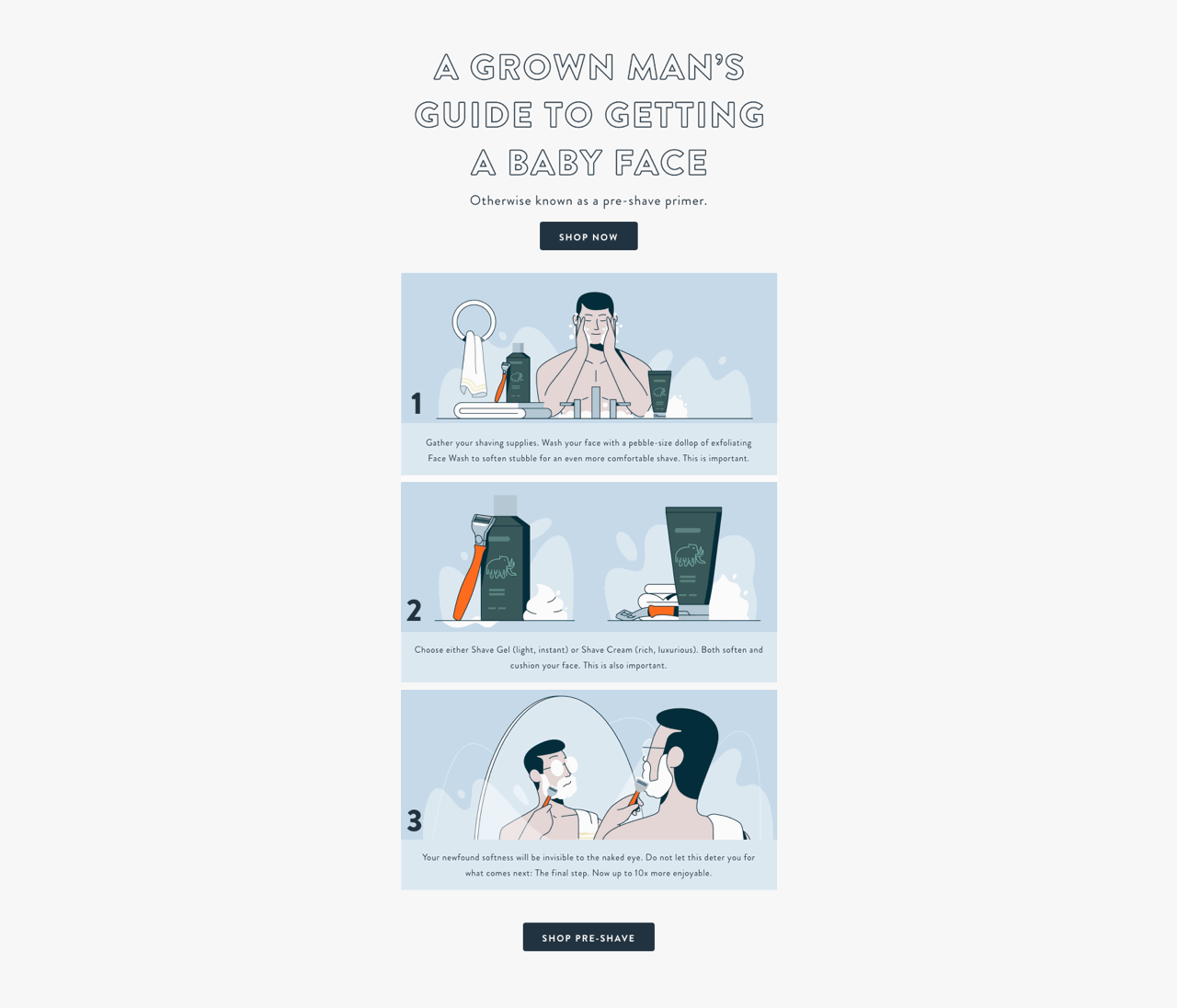 Ignoring to educate your audience is a mistake because it can be easily tied to your products. You could tell your audience how to fulfill their needs, with your products being the tools they need to do so, like Harry’s does in one of their emails