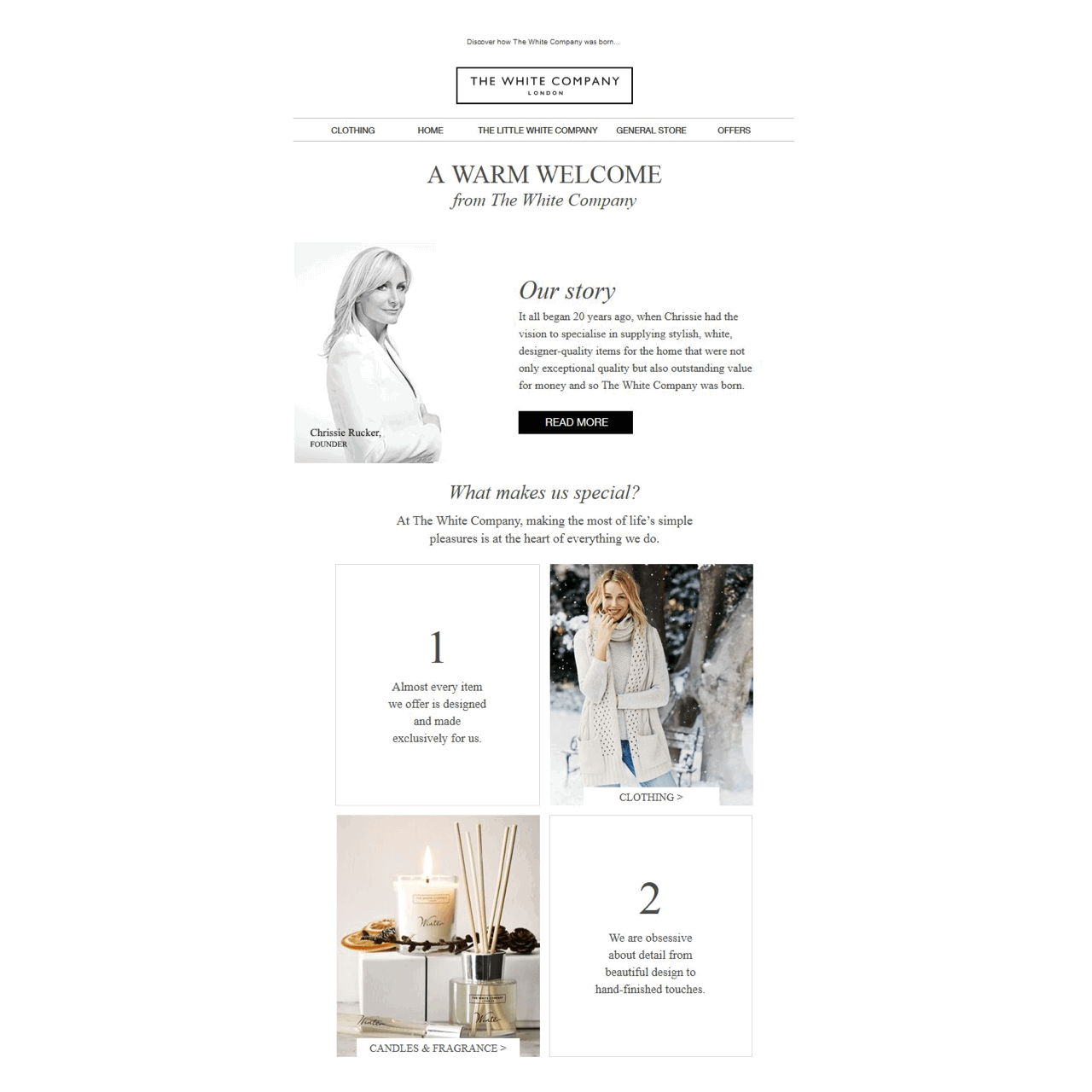 What’s more, talk about your brand’s story and its purpose. If possible, show them who’s behind the brand — I’m talking about displaying the faces of those who run the company, like in the case of Beardbrand as shown above or The White Company as shown below.