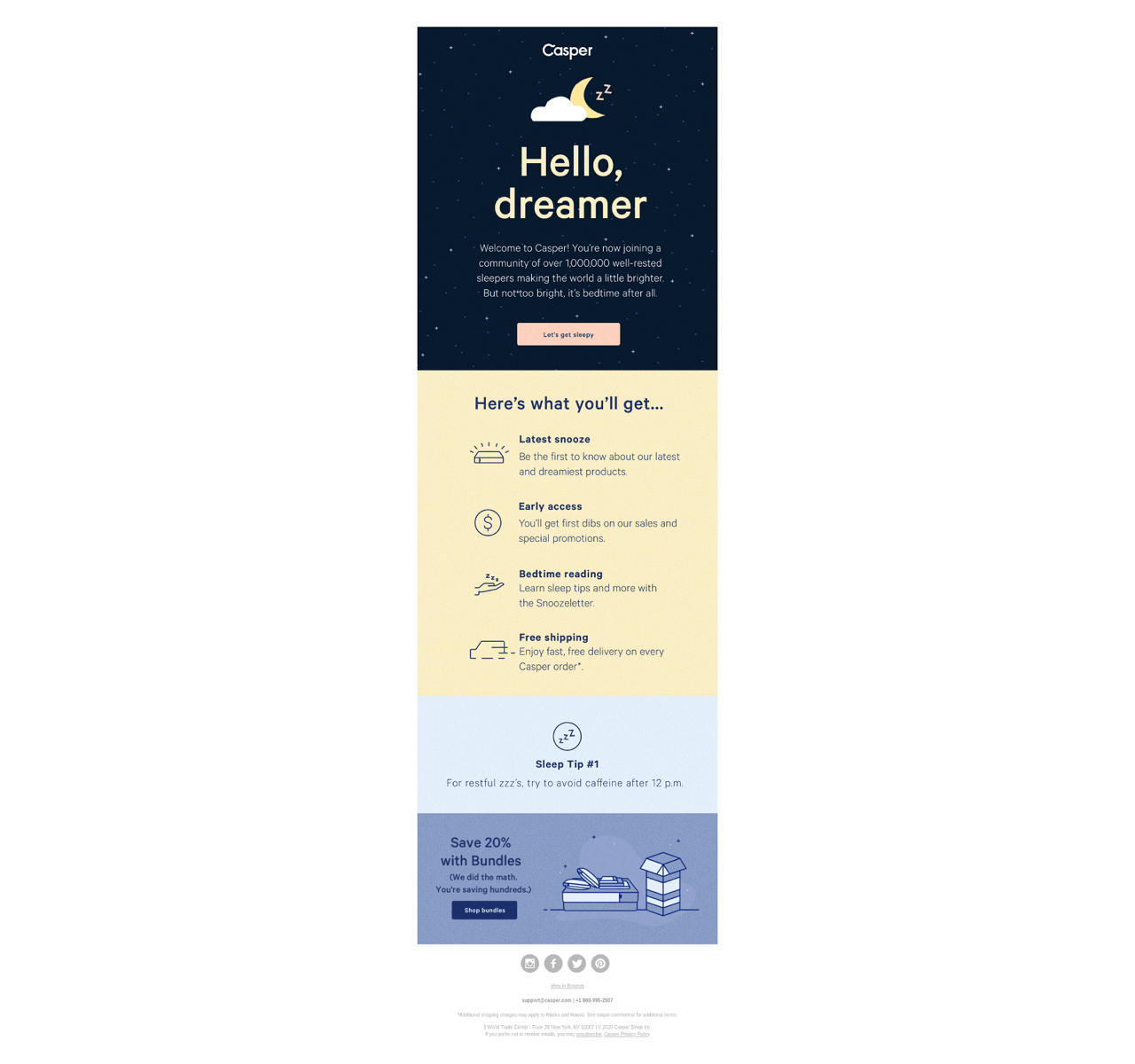 Casper's campaign is awe-inspiring as they send that email on the third day after a subscriber signed up. Casper team doesn't assume subscribers are ready to buy at that point, so they nurture them patiently. Such is the power of welcome emails.