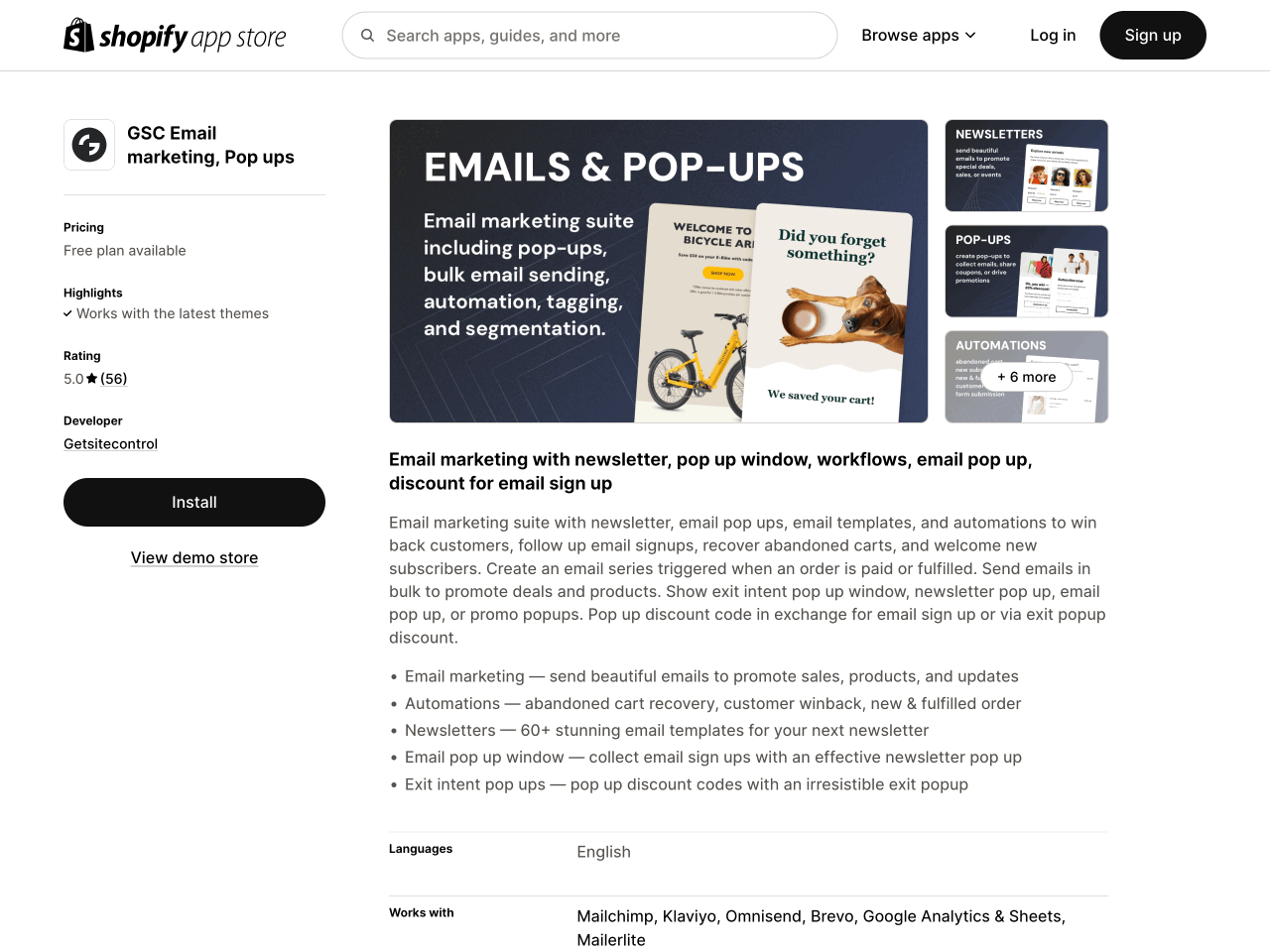 GSC Email Marketing, by Getsitecontrol, is an email marketing app for small Shopify brands that want to send newsletters and set up automations without getting overwhelmed by complex workflows. It combines email marketing features with built-in signup forms, and promo popups — so there’s no need for extra apps.