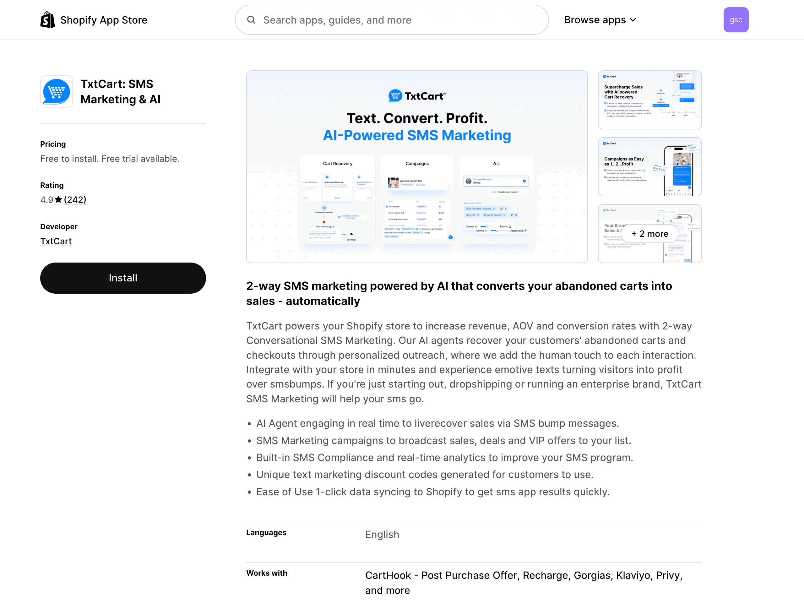 | TxtCart | AI-powered SMS marketing and abandoned cart recovery | ❌ No free plan, but a 14-day free trial | Plans from $29/month, plus $1,000 in free campaign credits |