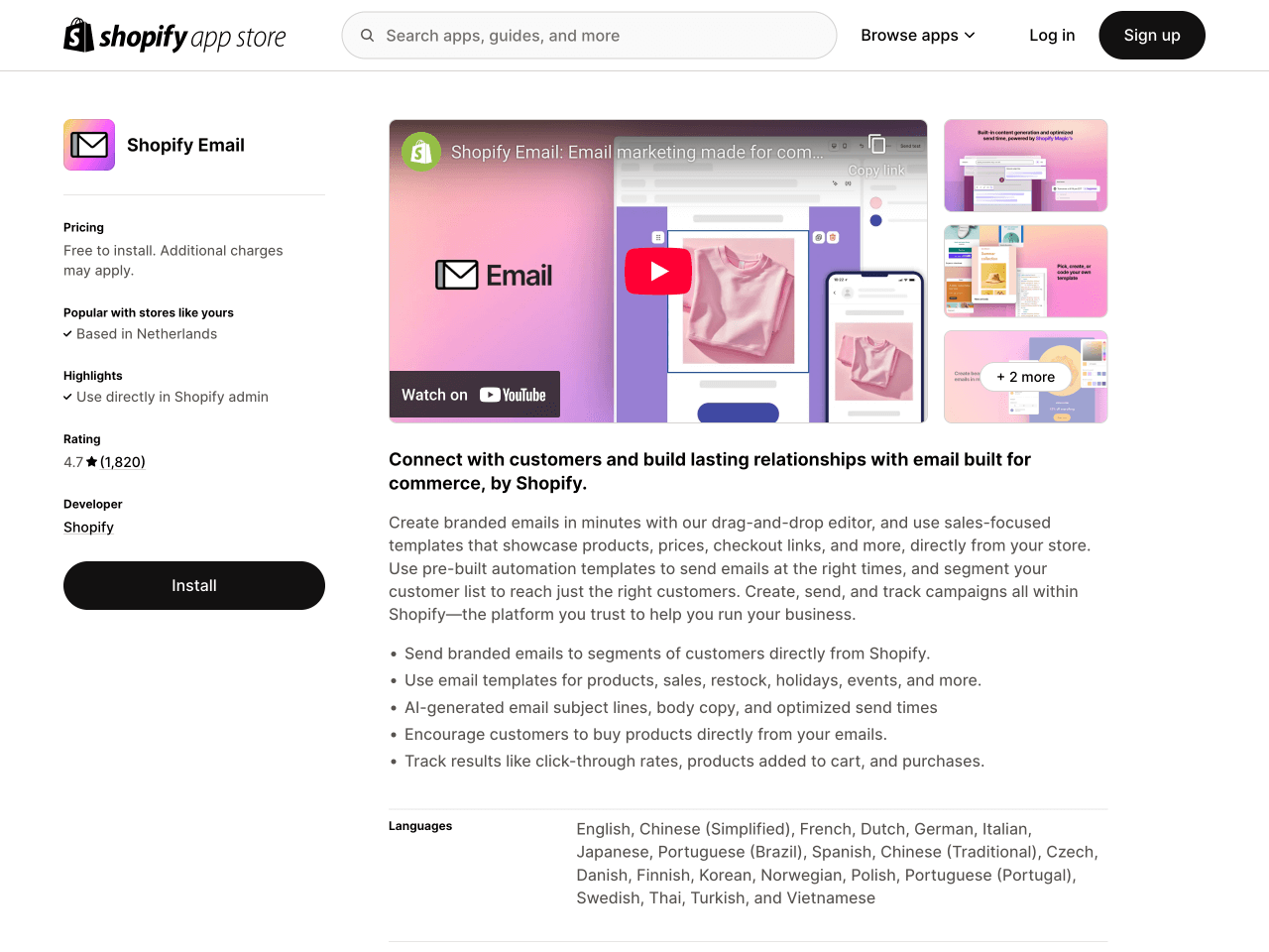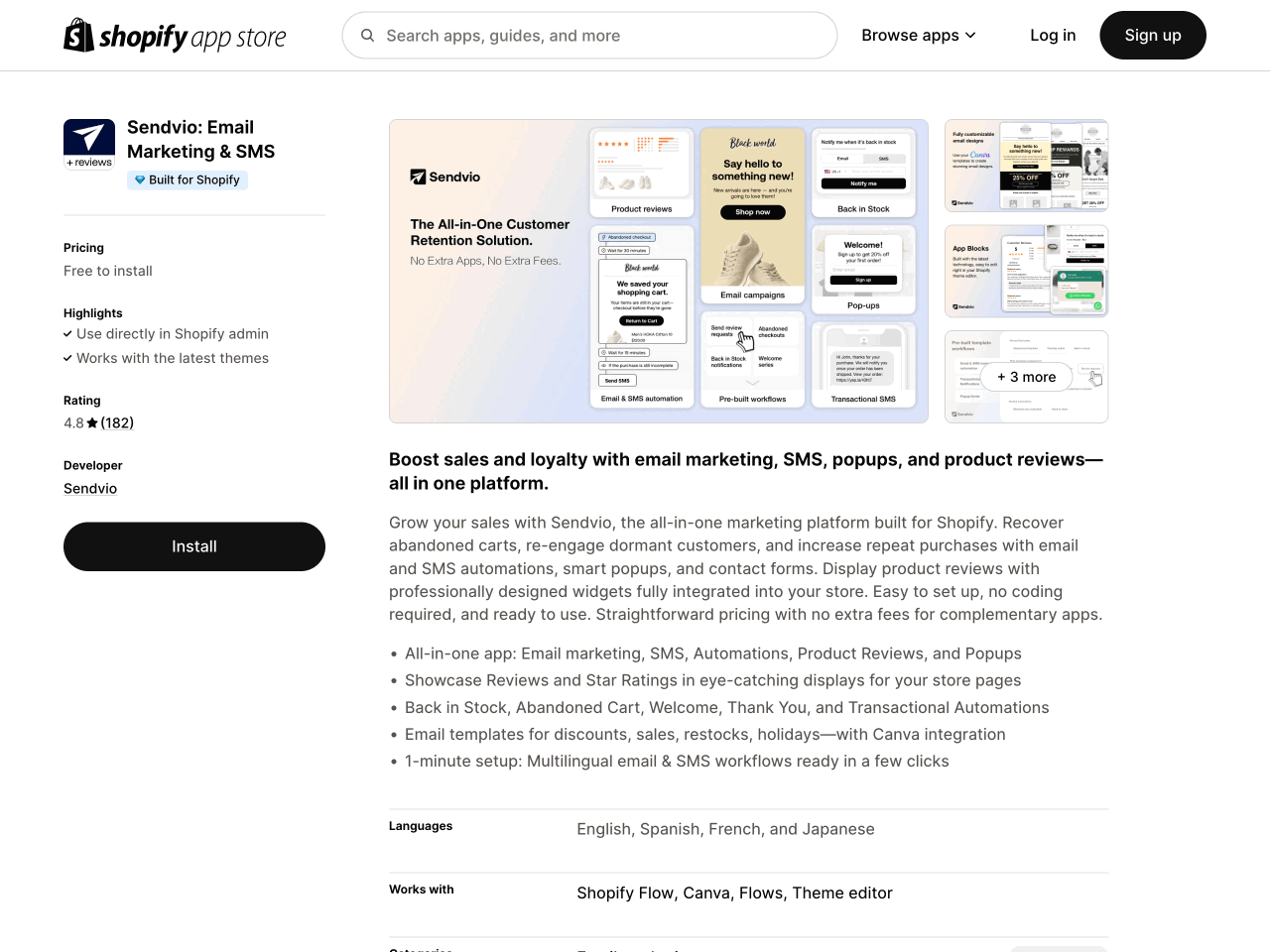 Shopify merchants get access to premium features (like advanced segmentation, automations, unlimited subscribers, and a custom domain) without paying extra — a big differentiator from Klaviyo.