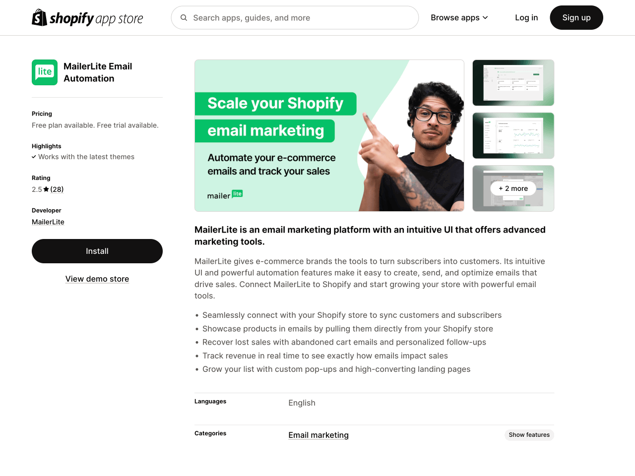 MailerLite is a Klaviyo alternative popular among small businesses for its clean, beginner-friendly interface. It’s easy to create professional emails without coding, and even on lower-tier plans, you get access to landing pages, product blocks synced with your Shopify store, and essential ecommerce automations like abandoned cart recovery.