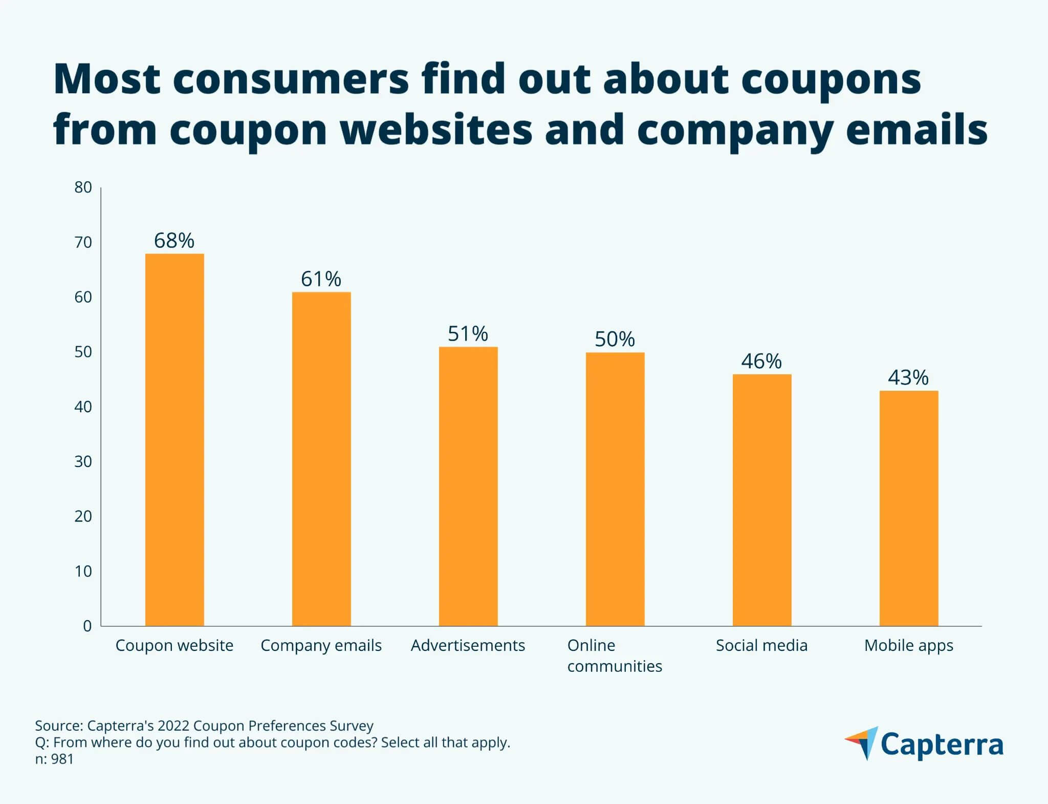 Research shows that consumers discover deals through multiple touchpoints. According to Capterra's Coupon Preferences Survey, 68% of shoppers find coupons on coupon websites, while 61% discover them through company emails.