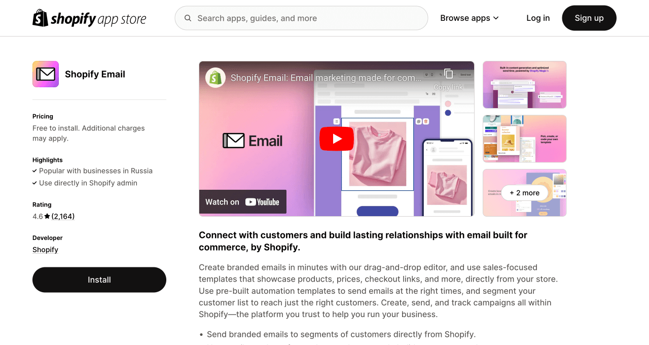 Shopify Email is free to install. The first 10,000 emails every month are free. After that, plans start at $1/1000 emails per month.
