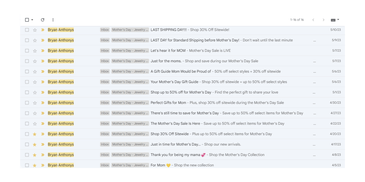There’s no one-size-fits-all answer to this question. Based on our analysis, the average Mother’s Day email campaign consists of six emails. However, this number varied significantly in 2023, with some brands sending as few as four and others reaching up to 16.