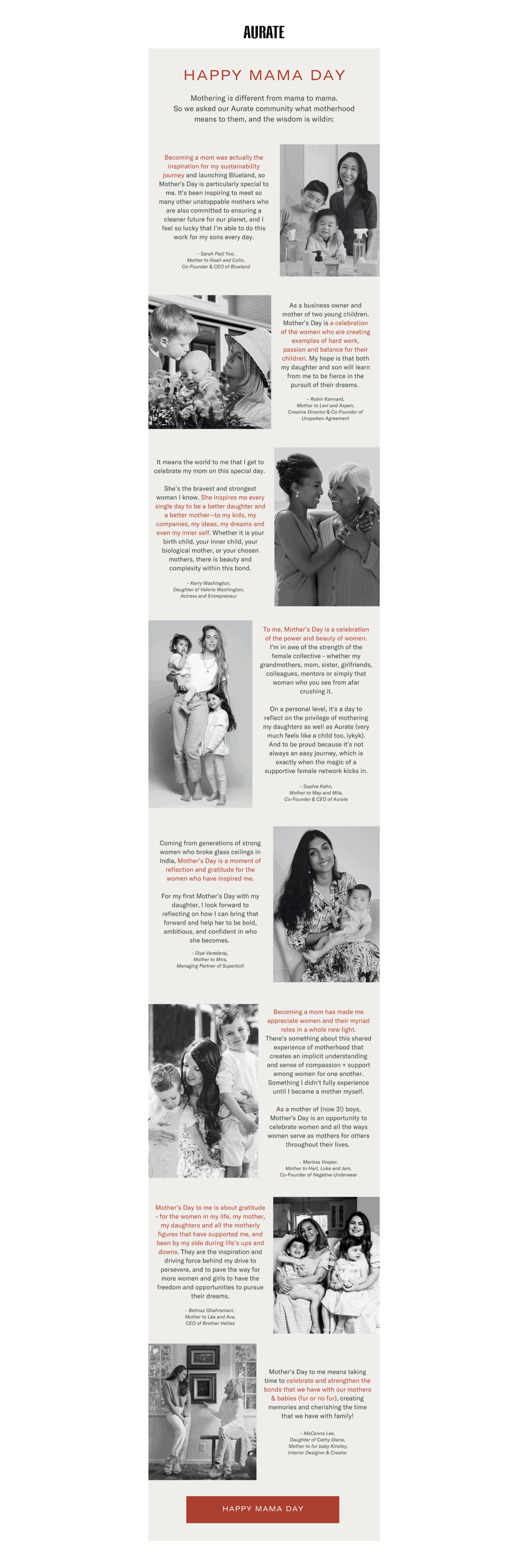 The second example in this category is by Aurate’s founders who put together an inspiring collection of customer stories on what motherhood means to them.
