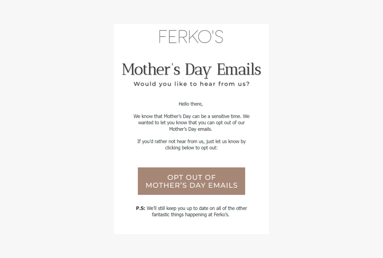While being one of the most heart-warming holidays, Mother’s Day can also be tough on many. That’s why it’s a thoughtful practice to give your subscribers an opportunity to opt-out – right at the beginning of your campaign.