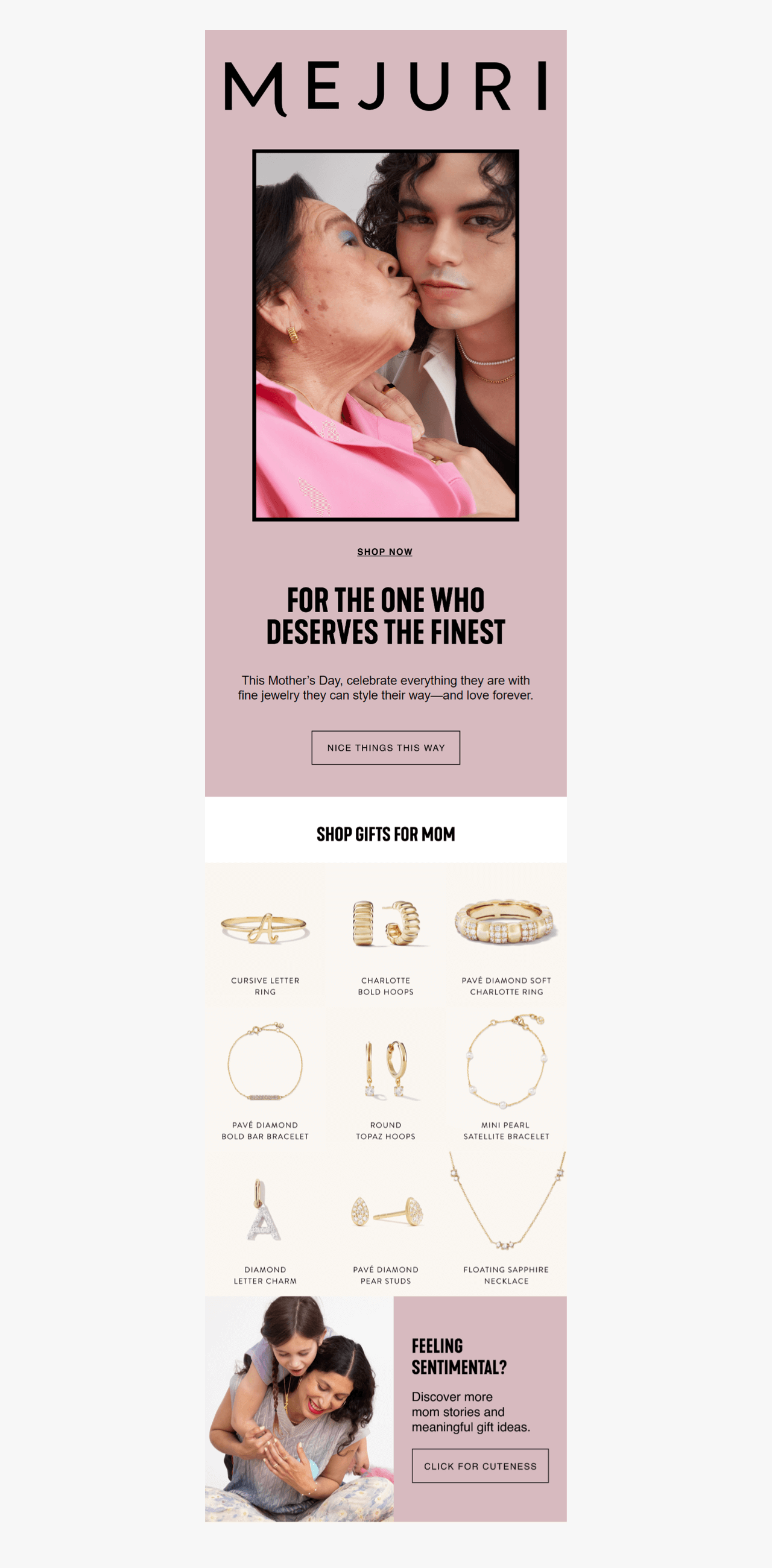 To help you out, we analyzed over 30 Mother’s Day email campaigns run by jewelry brands in 2023. Then we picked email examples that worked especially well.