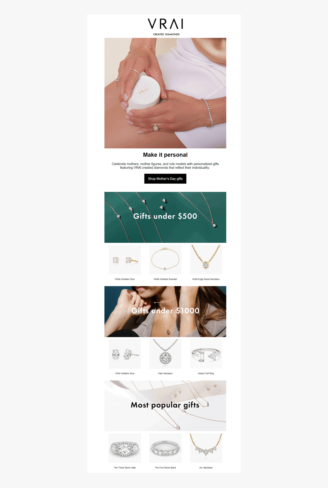 For example, VRAI featured gift collections under $500 and under $1000 in their campaign to make it easier for customers to navigate: