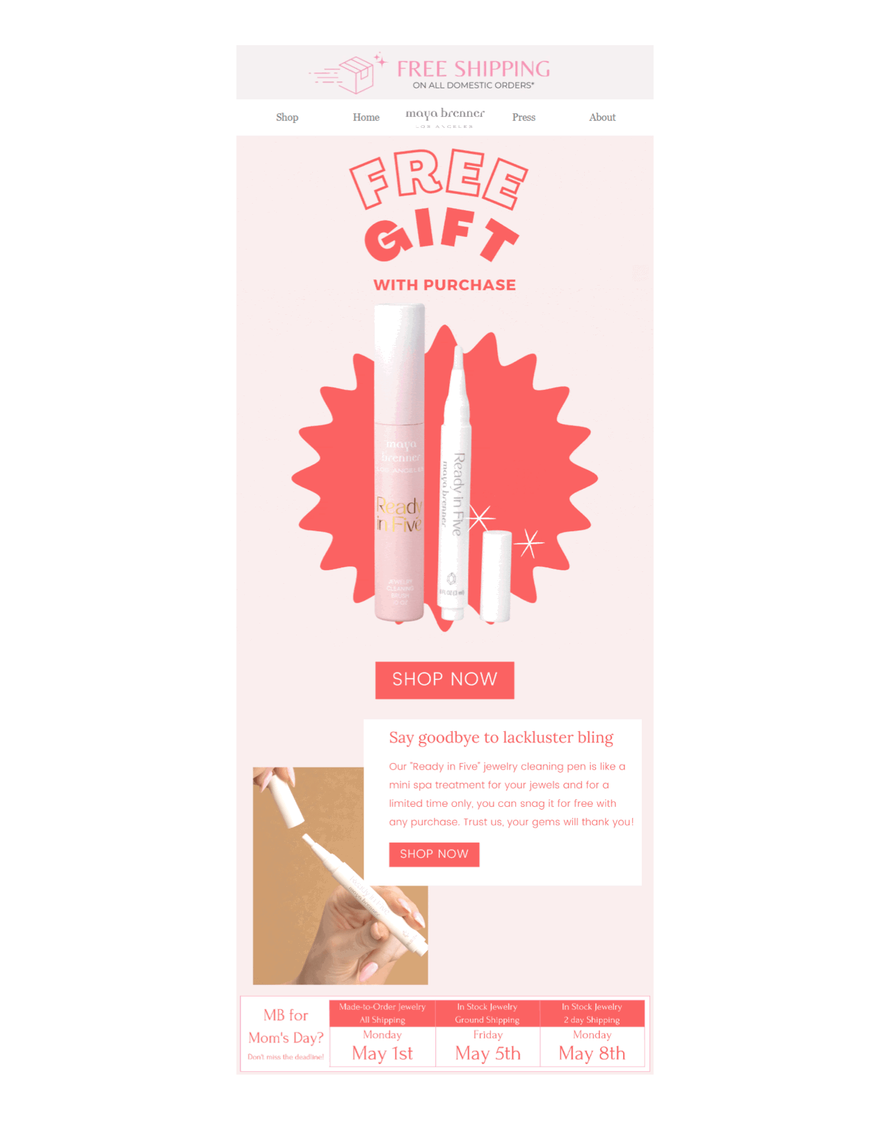 The second, less explicit way is to add your shipping schedule to every email in your Mother’s Day promo campaign. Maya Brenner did exactly that: