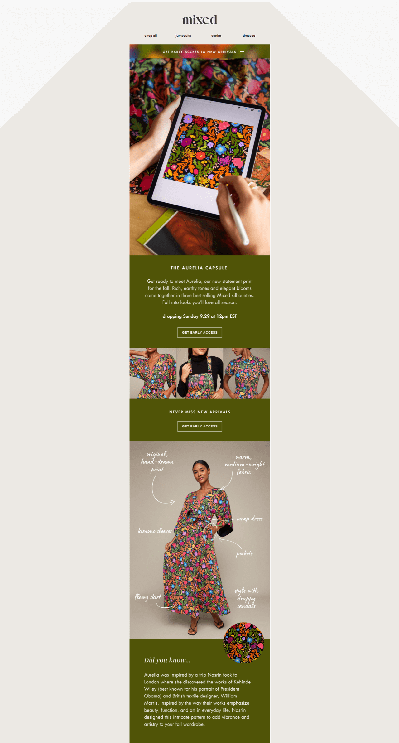 The teaser email by Mixed, in the example below, talks about the upcoming collection even more extensively, getting into details about the features and inviting customers to join the waitlist for early access.
