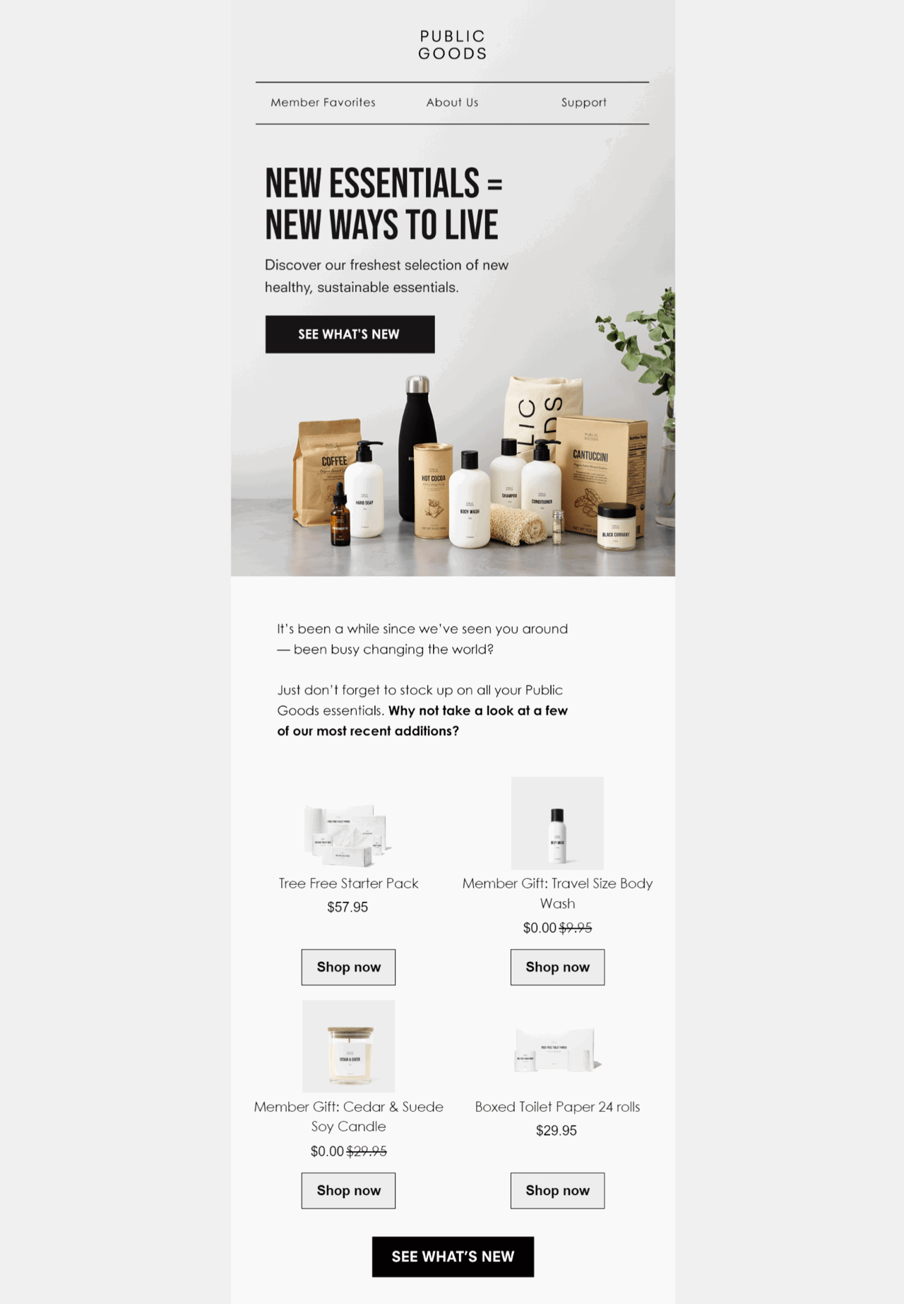 That’s exactly what Public Goods does by reminding what their brand is about and suggesting discovering new additions.