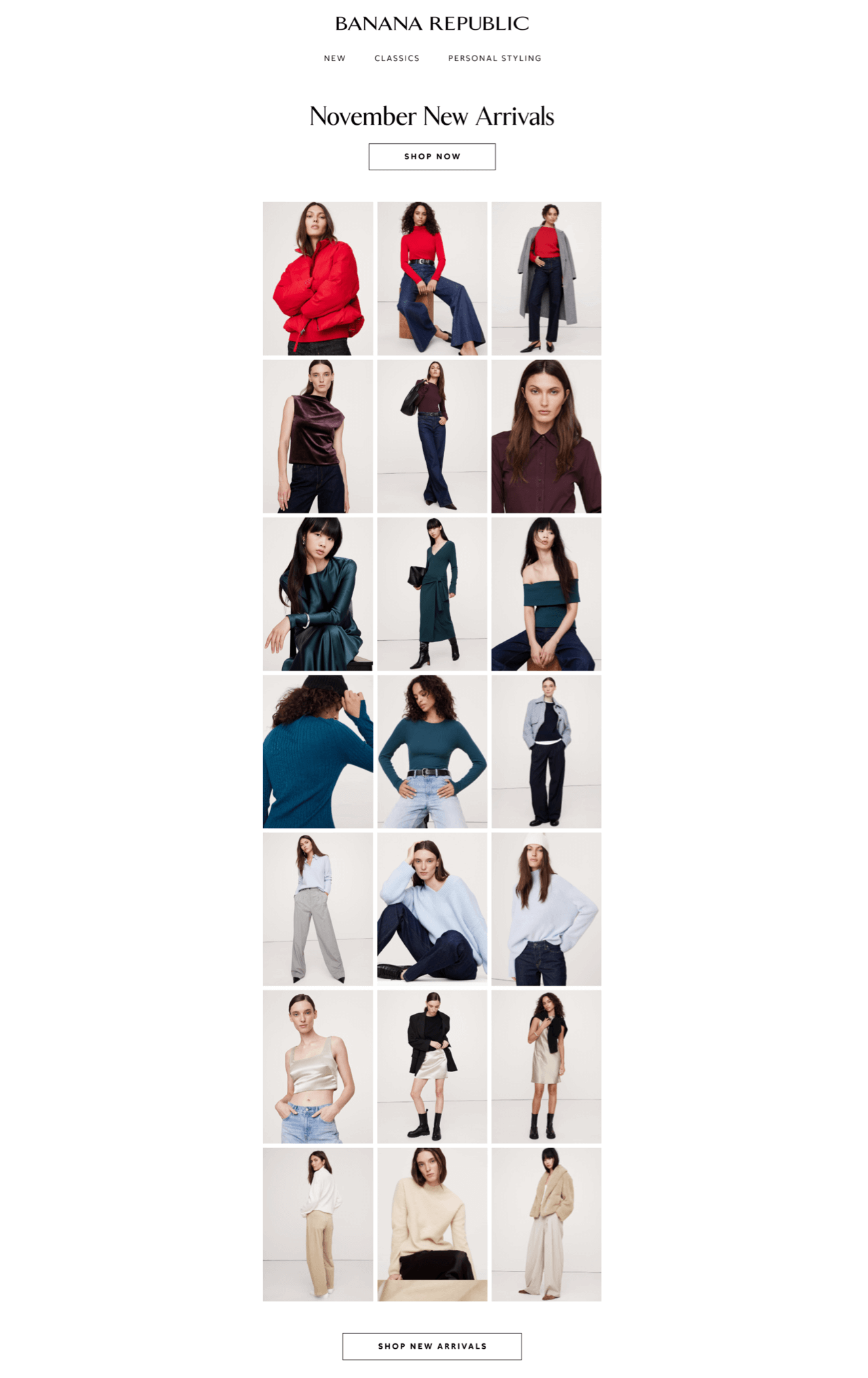 For example, Banana Republic uses a grid of product images, organized by color tones to give a high-level idea of what the new collection includes.
