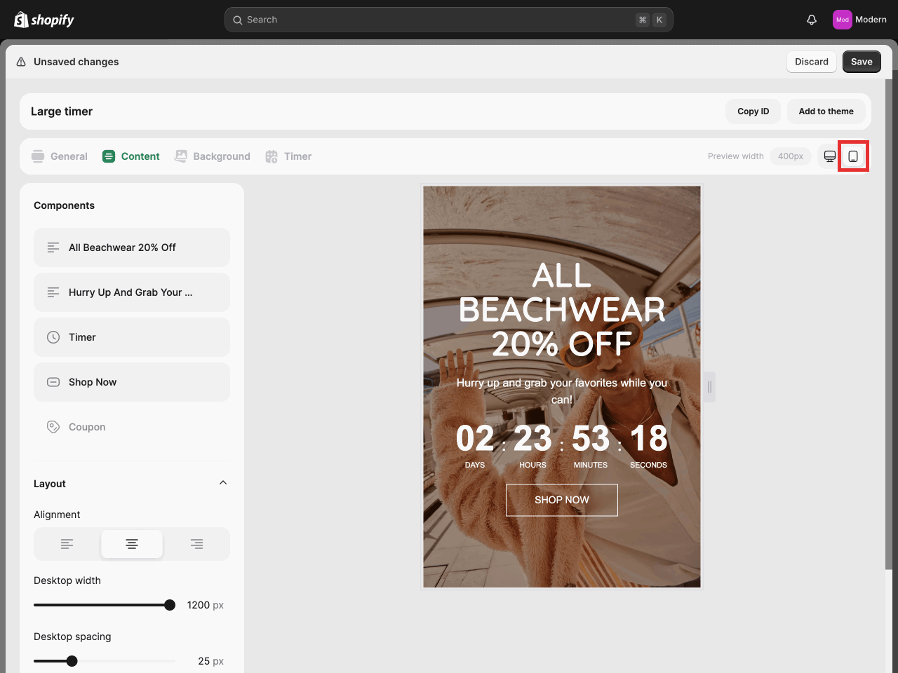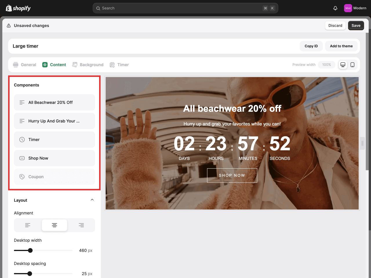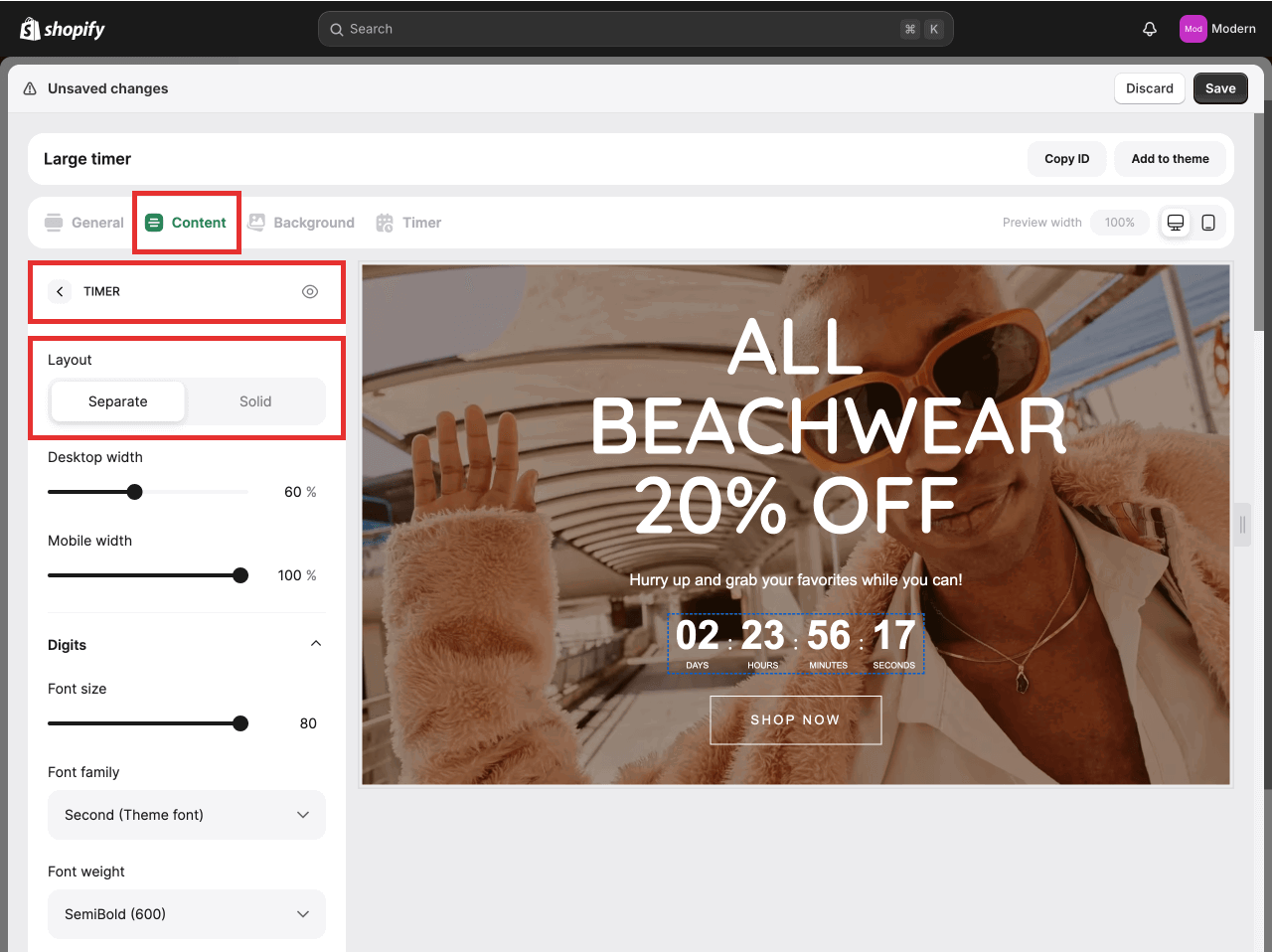 From the Timer section of the Content tab, choose a layout for your timer and adjust the width, digit, and label settings.