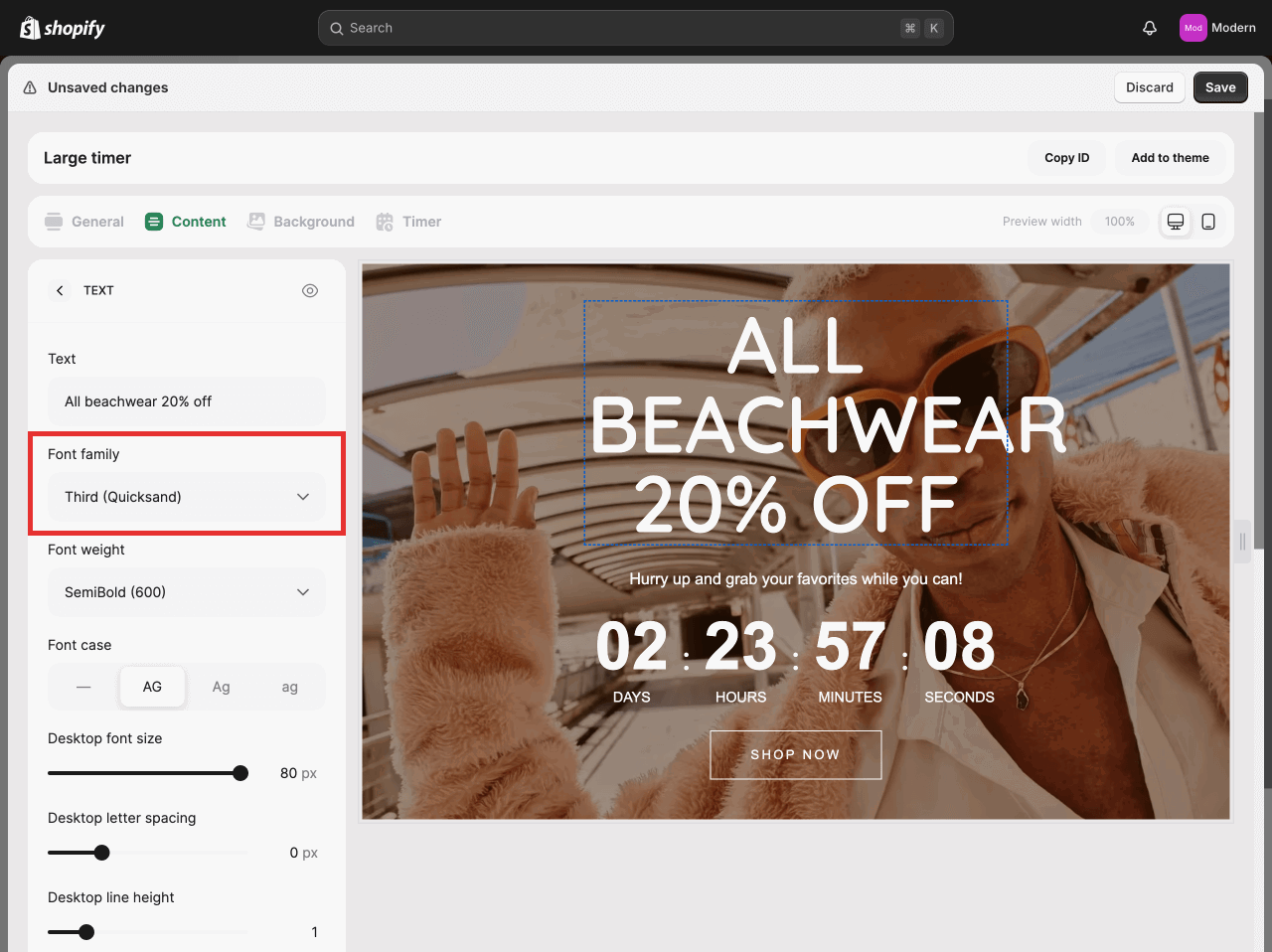 ❗ Note that if you choose to apply your theme’s font, you won’t see it in the preview of the countdown timer app. You’ll be able to see the theme font applied to the timer in the theme editor, theme preview, or on your live store.