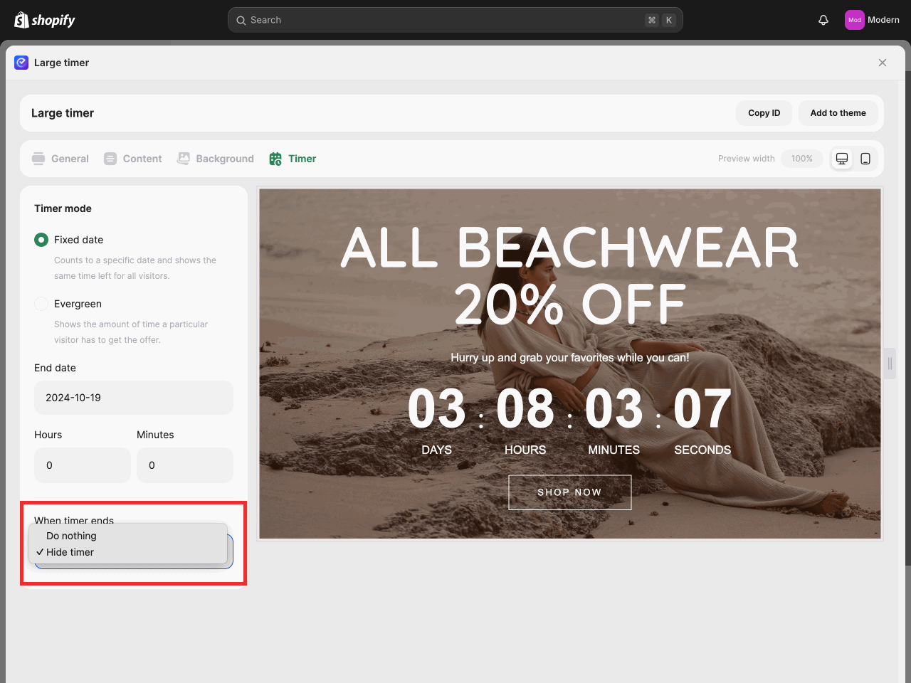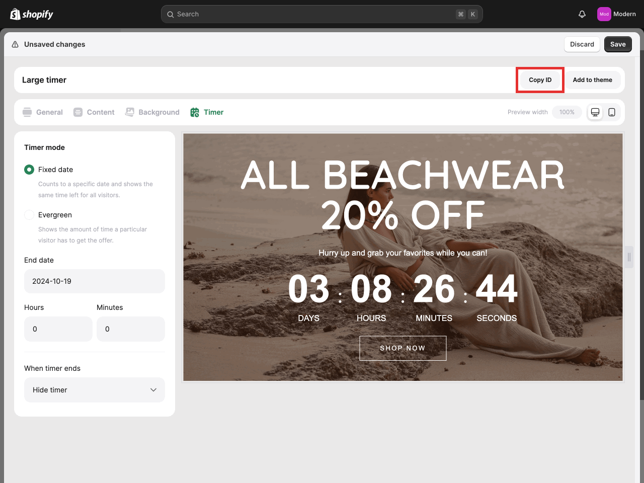 When you’re done setting up the timer, save the changes and copy the timer ID. You’ll need the ID to display the timer on your store: