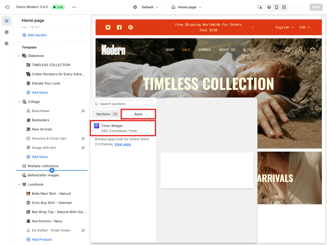 Open the theme editor and find the page where you want to add the timer banner. In this case, it’s the homepage. Add an app section where you want the timer to appear, and find GSC Countdown Timer among the available apps: