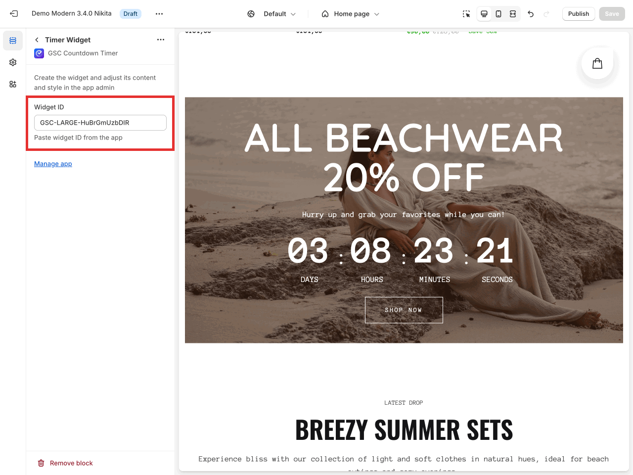Paste the ID of the timer in the dedicated field and your timer widget will appear in place