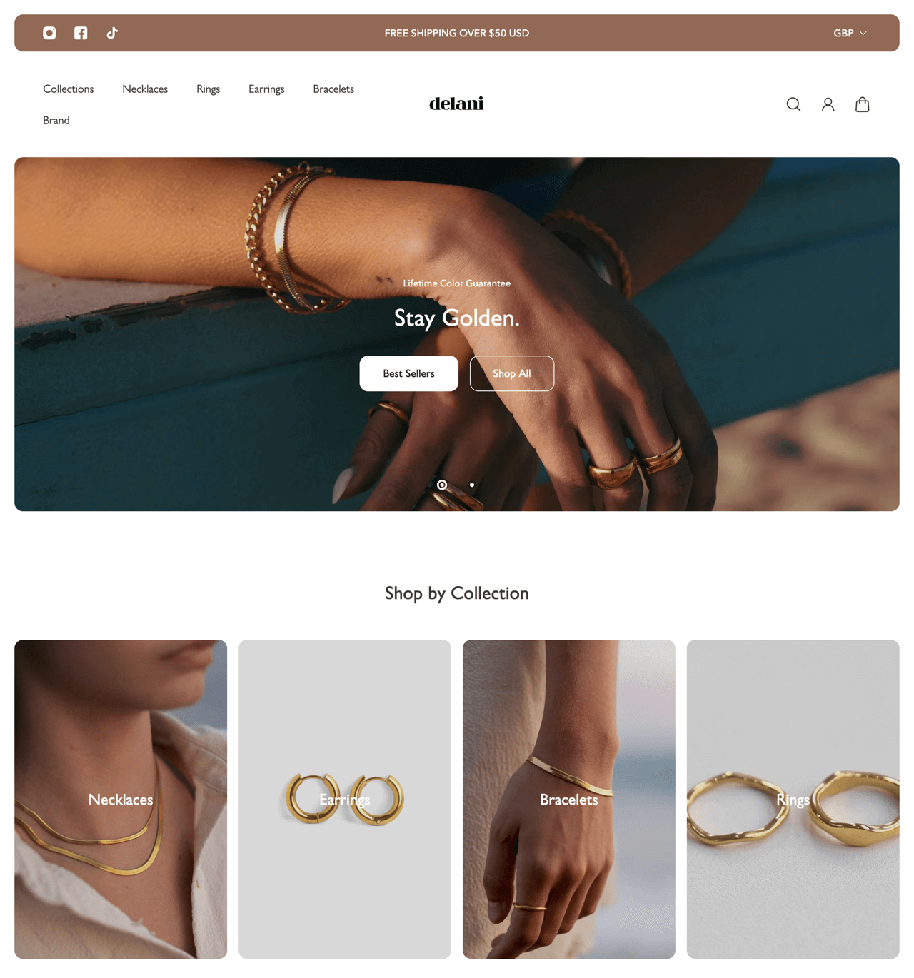 Delani Jewelry exemplifies how to blend aesthetic appeal with practical ecommerce solutions. Look no further if you’re seeking inspiration for your own Shopify jewelry store.