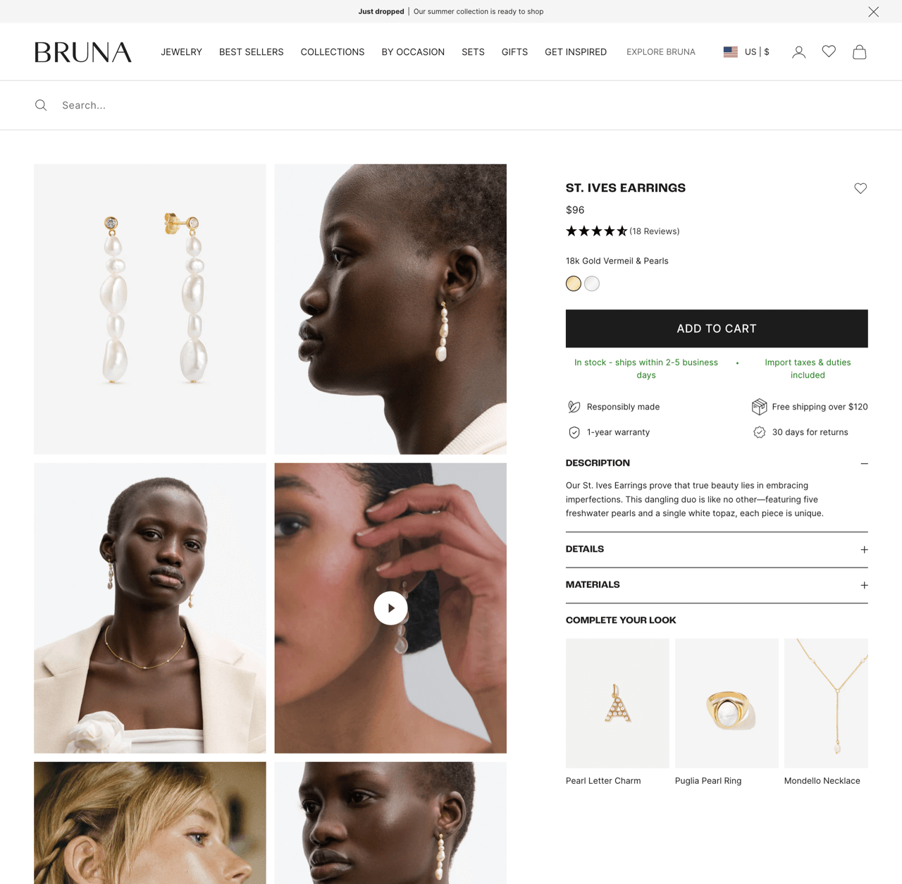 Instead of a conventional carousel, BRUNA’s product pages feature collages consisting of still images and videos. Note that despite the abundance of information, the layout remains neat and user-friendly. The compact swatches enhance the customer decision-making experience and the “Complete the look” section helps increase average order value (AOV).
