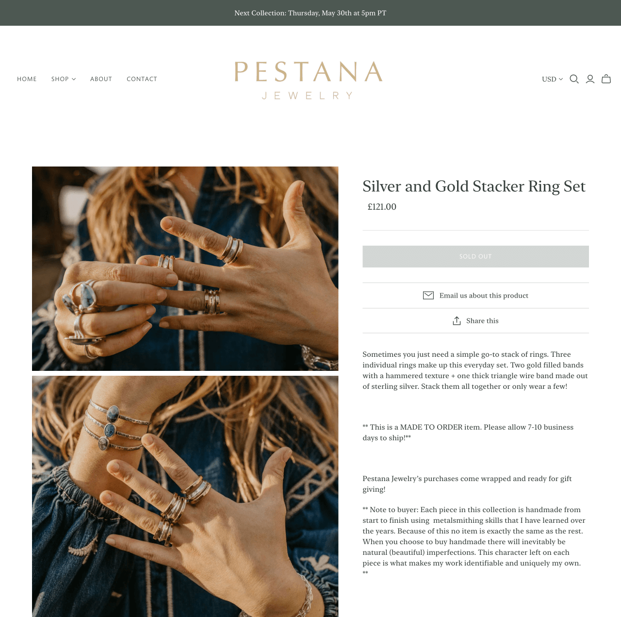 The product pages of Pestana Jewelry are notably straightforward and focused, ensuring a clear and concise shopping experience for visitors.