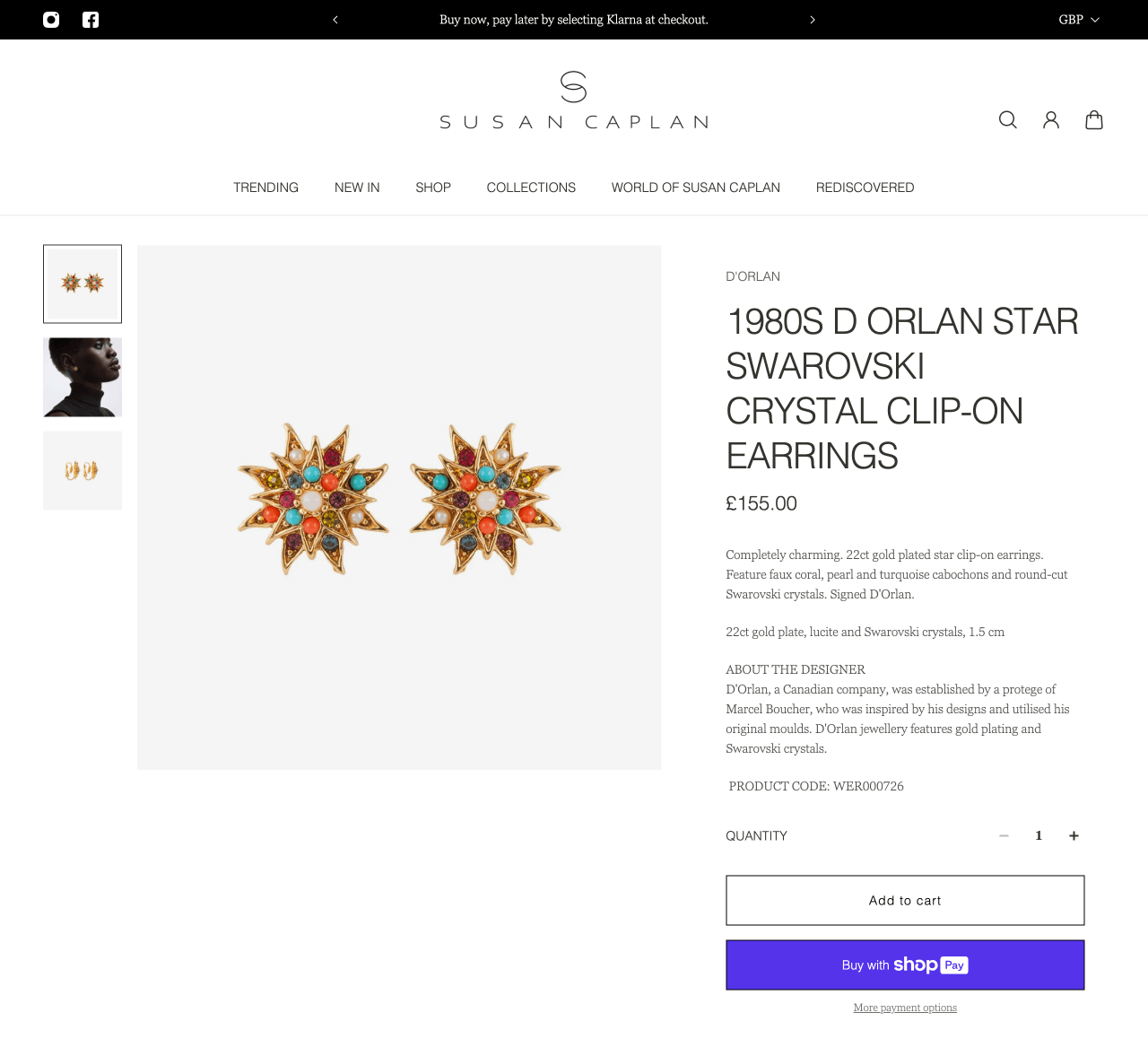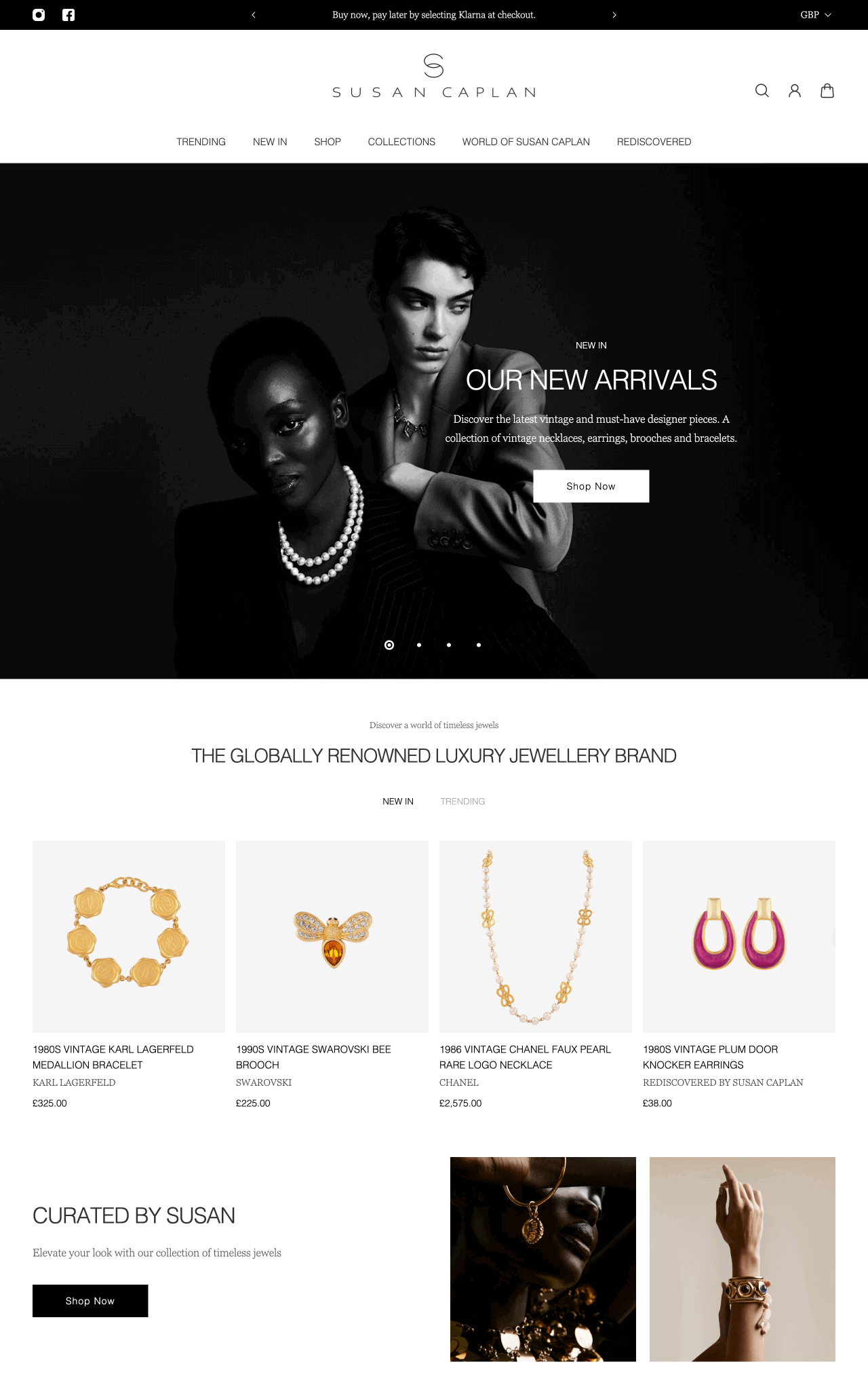 Overall, Susan Caplan’s website is not just visually stunning but also a goldmine of ideas for those designing their own Shopify jewelry store.