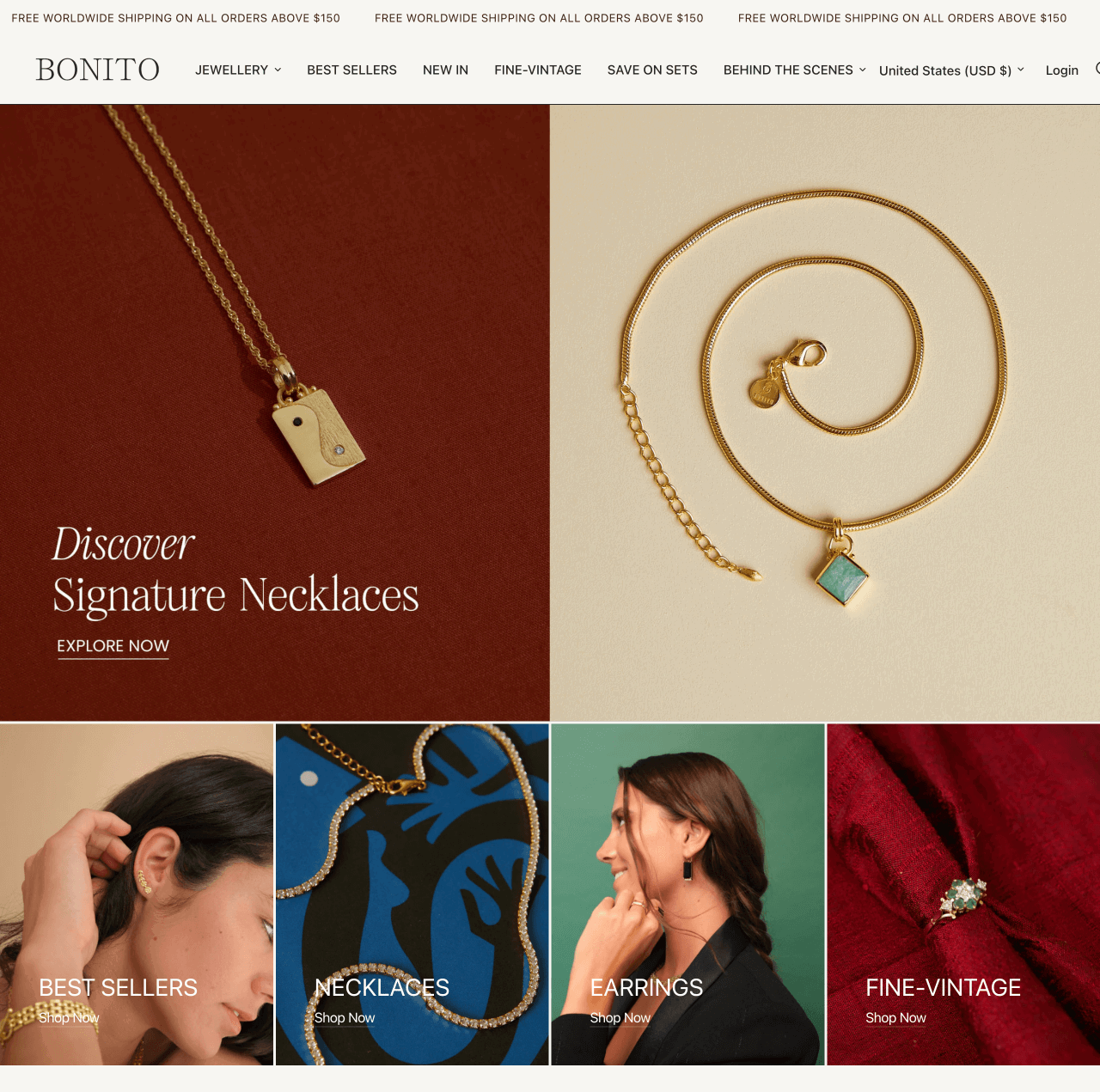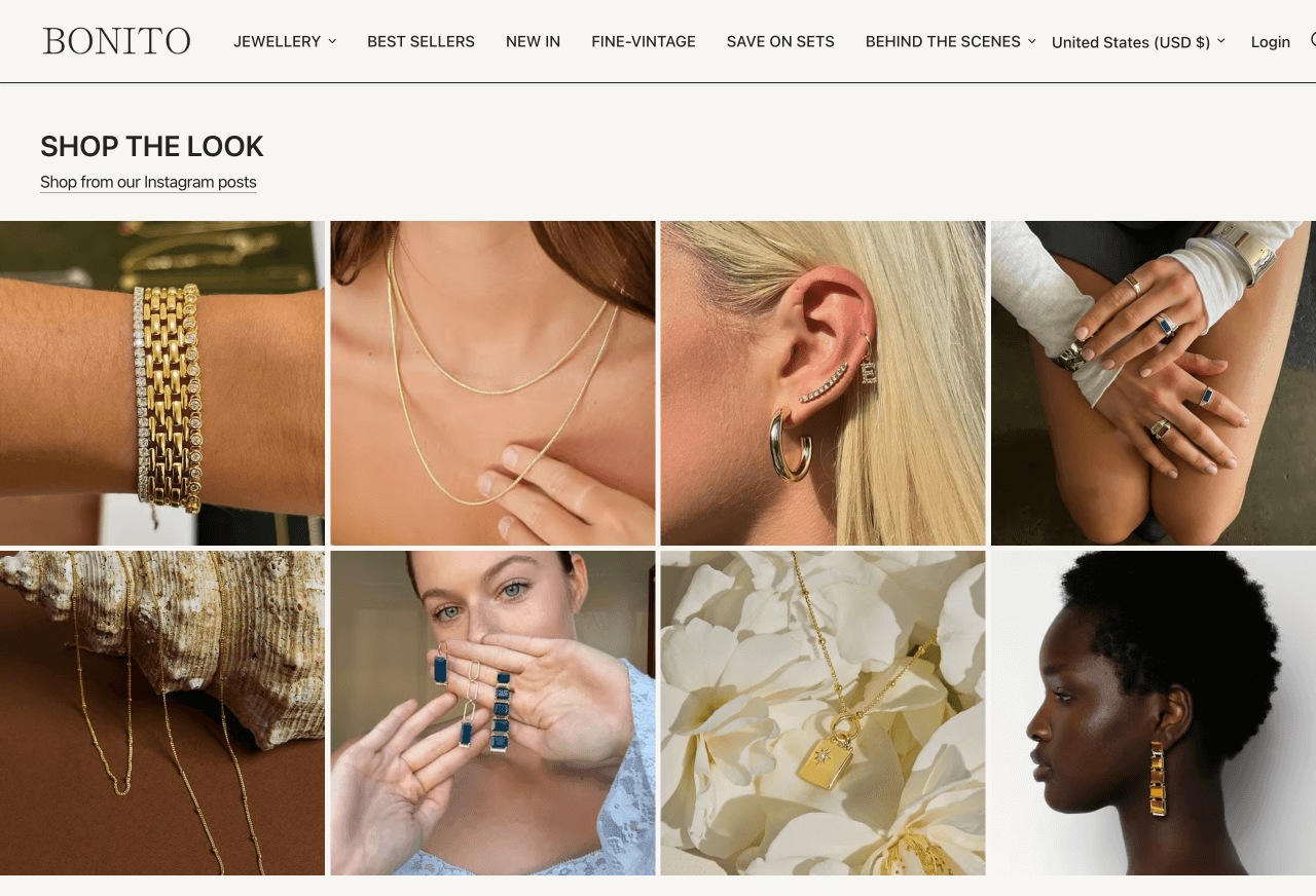 Bonito’s website design and earthy color theme effectively highlight its eco-friendly ethos. Product discovery is enhanced by in-menu promotions, featured product sections, and the Shop the look gallery made up of user-generated content (UGC) which also perfectly serves as social proof.