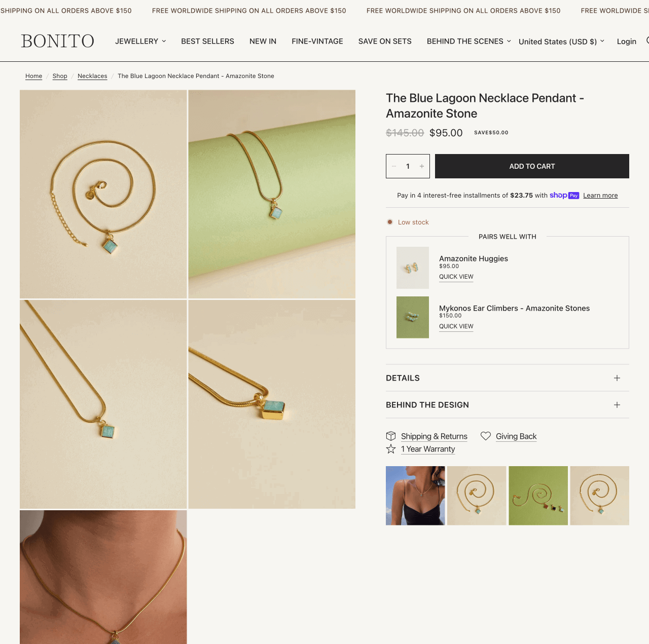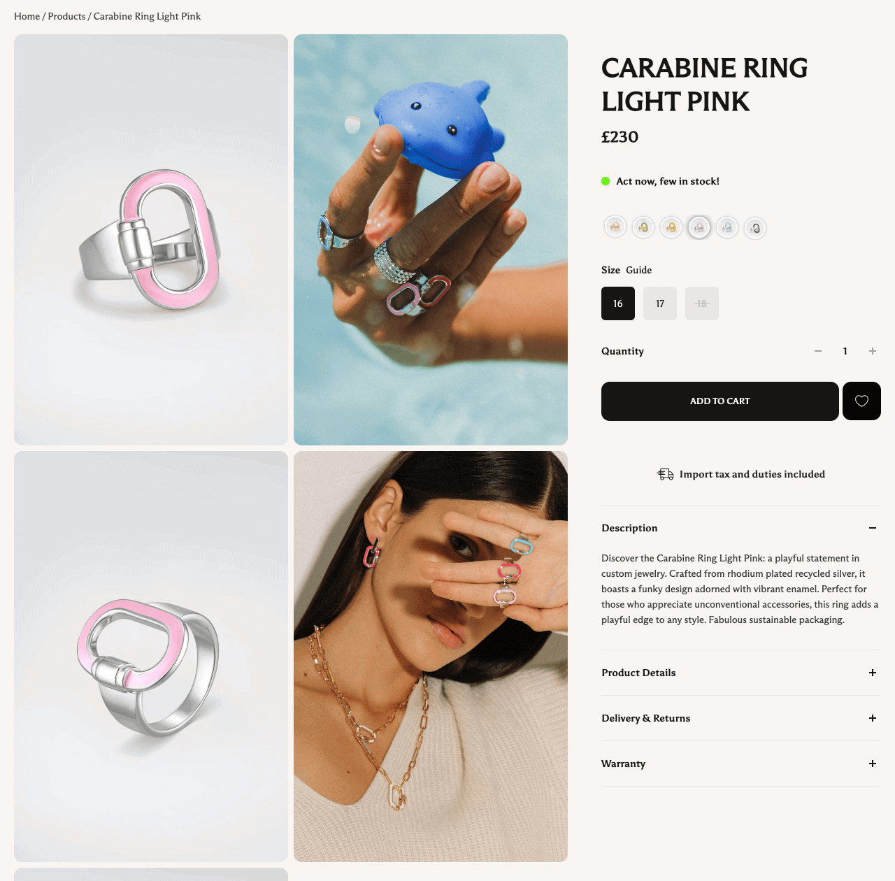 Although slightly cluttered, the product pages are packed with detailed information, ensuring customers have all they need to make informed decisions. Three particularly noteworthy details are the highlighted savings, the Buy Now Pay Later (BNPL) option, and the ‘Low stock’ alert. Seemingly small additions, they are designed to alleviate objections and boost conversions.