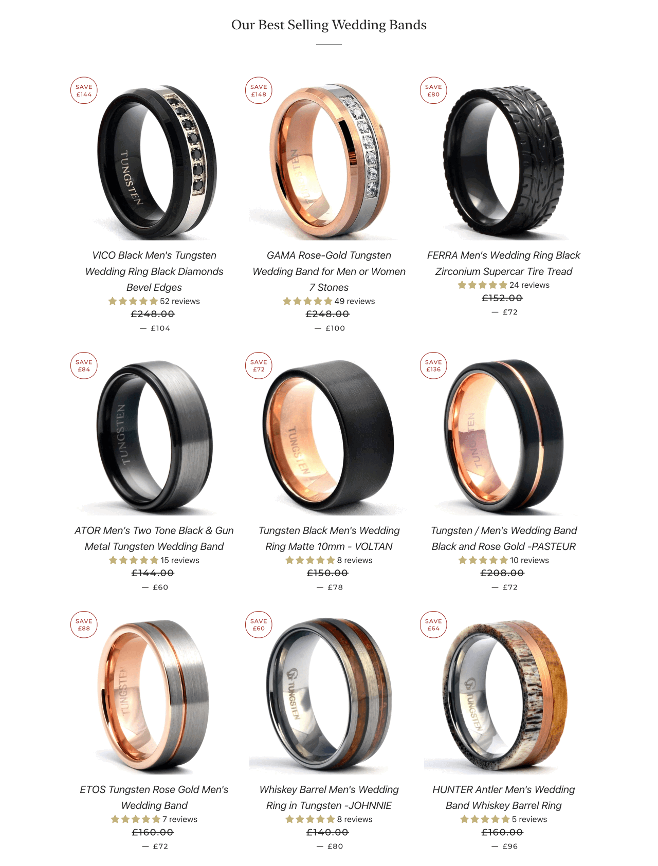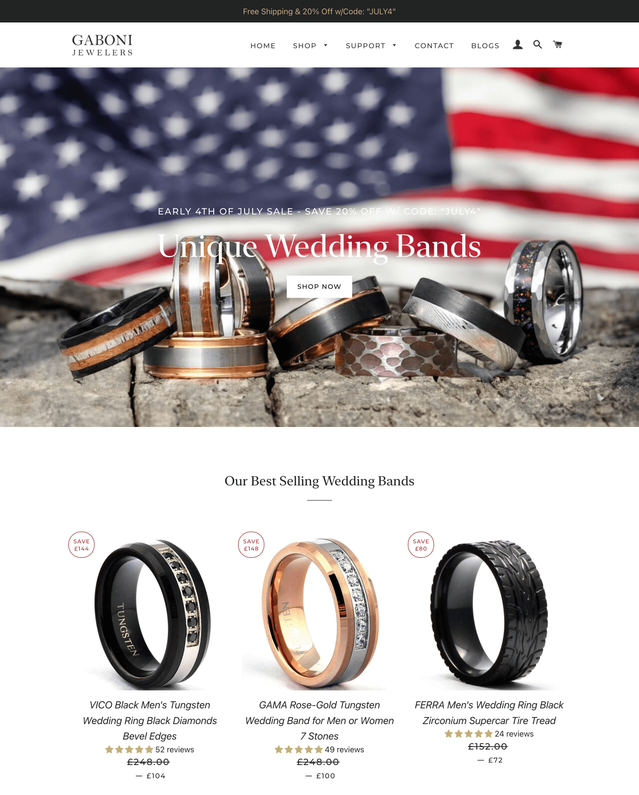 Gaboni offers high-quality, affordable wedding rings made from durable metals like titanium and tungsten carbide. Their unique designs include custom pieces and sterling silver rings with simulated diamonds.
