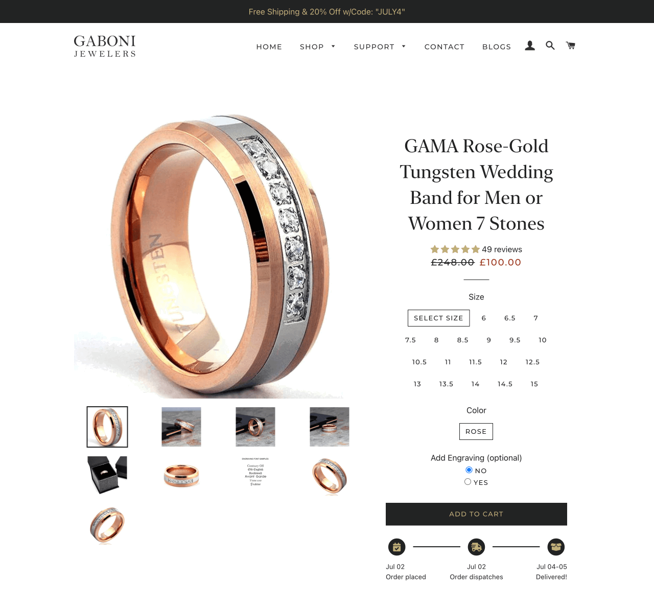 Gaboni's product pages follow a standard layout with a few unique features. For example, customers can select engraving options and font styles through dedicated menus, adding a personalized touch to their bands. Additionally, the delivery timeline projection provides clear expectations on shipping times, enhancing the customer experience.