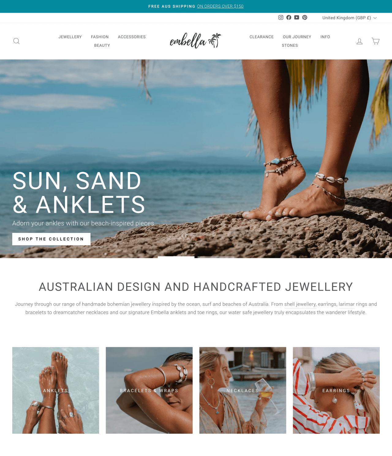 Embella is a prime example of a beautifully designed Shopify jewelry store that uses visual storytelling and a thoughtful structure to connect with its audience.