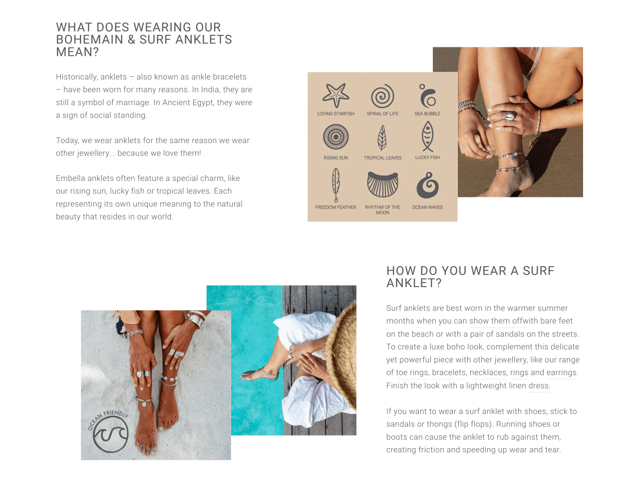 This storytelling approach continues on the product collection pages, where you can learn about the meaning of each piece and best practices for wearing them. These content insertions not only help the brand resonate with customers but also improve the store’s SEO.