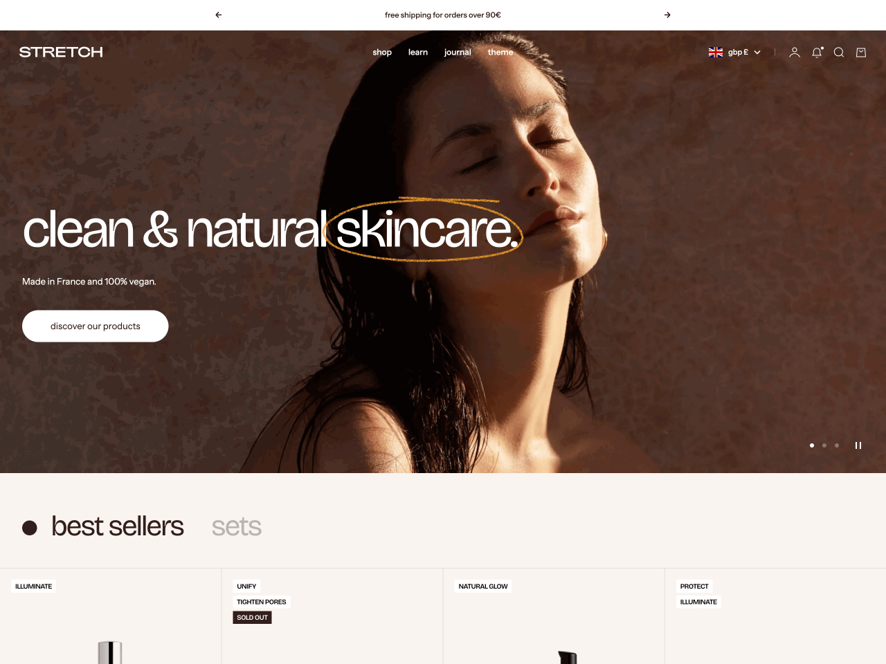 Stretch supports all essential ecommerce features — from sticky cart and quick buy to trust badges and product videos, making it a strong choice for beauty stores looking to scale.