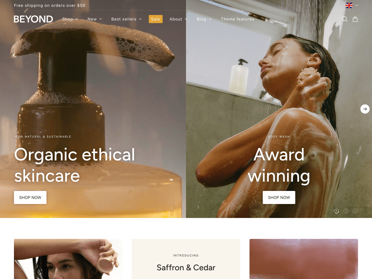 The Beyond Shopify theme is one of the top choices for ethical and eco-friendly brands. With an array of features tailored to enhance user experience, Beyond is an ideal theme for high-volume stores and brands committed to a sustainable future.