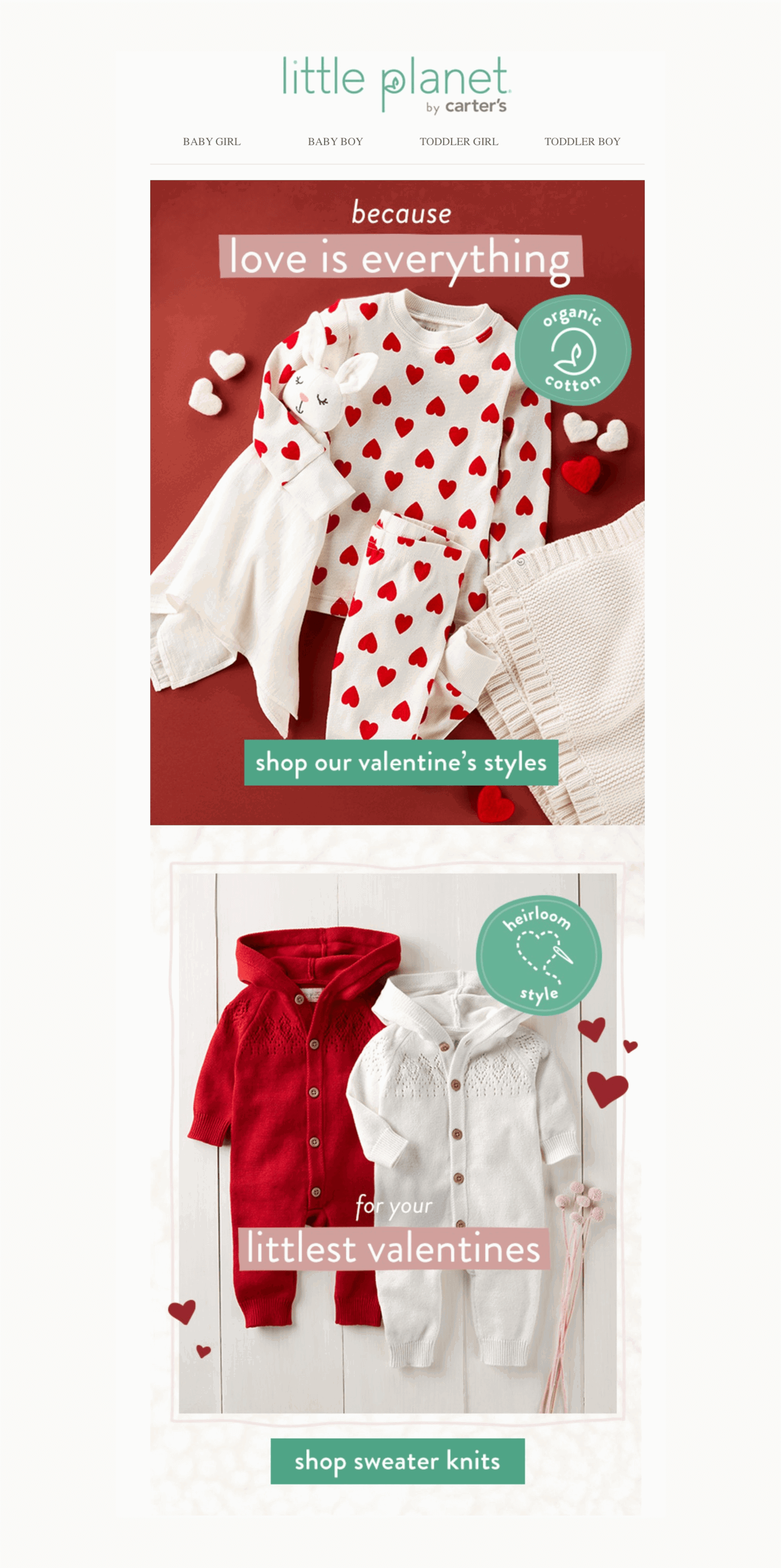 Even if you think most of your audience won’t be interested in Valentine’s Day — let’s say because you sell kids' clothes — you can position your campaign around the love towards their loved ones, much like Mother’s Day.
