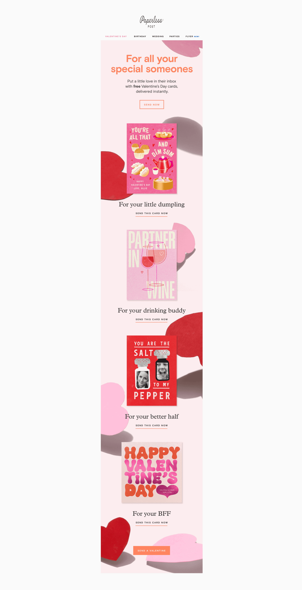 Note that these emails don’t have to be exclusively about your Valentine’s Day offers. For example, Barnes & Noble sends weekly promo emails in January featuring a small but noticeable Valentine’s Day section.