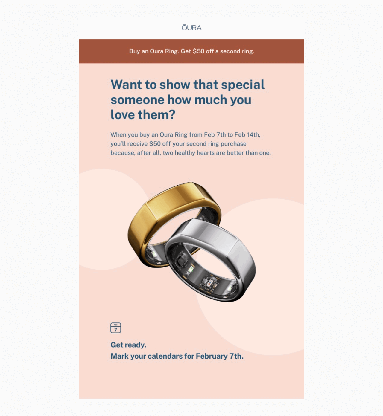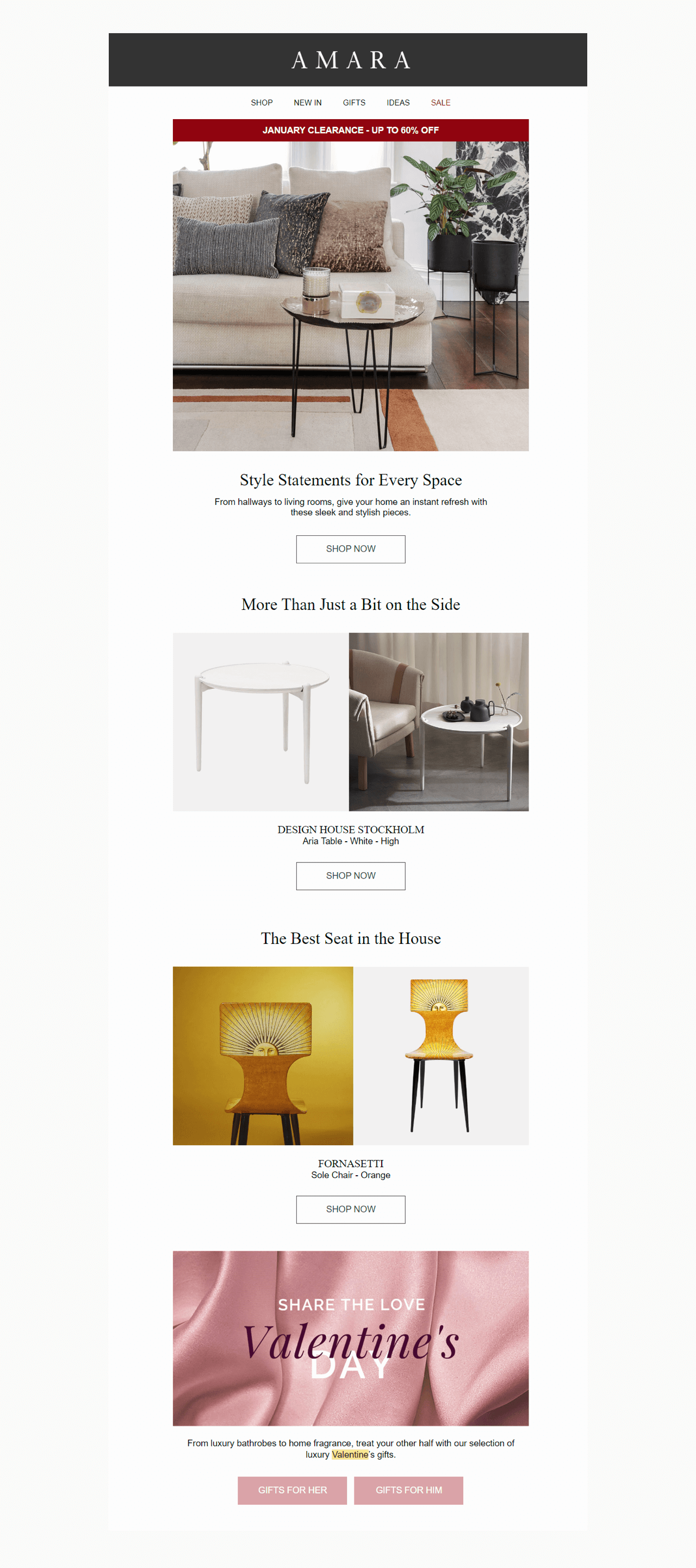 Alternatively, you can dedicate a larger section of your January emails to the upcoming Valentine’s Day sale or gift ideas – like Amara does in the example below.