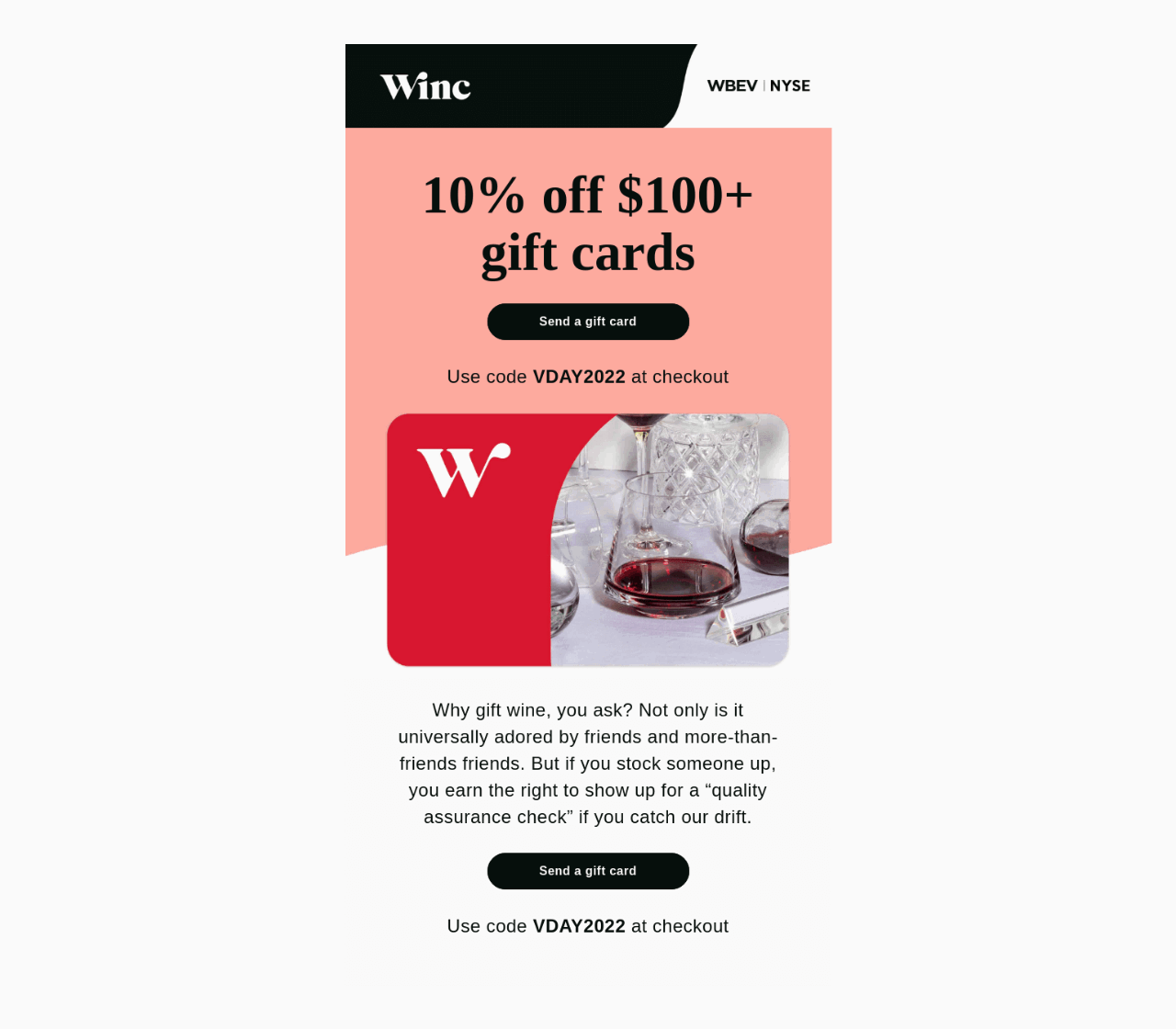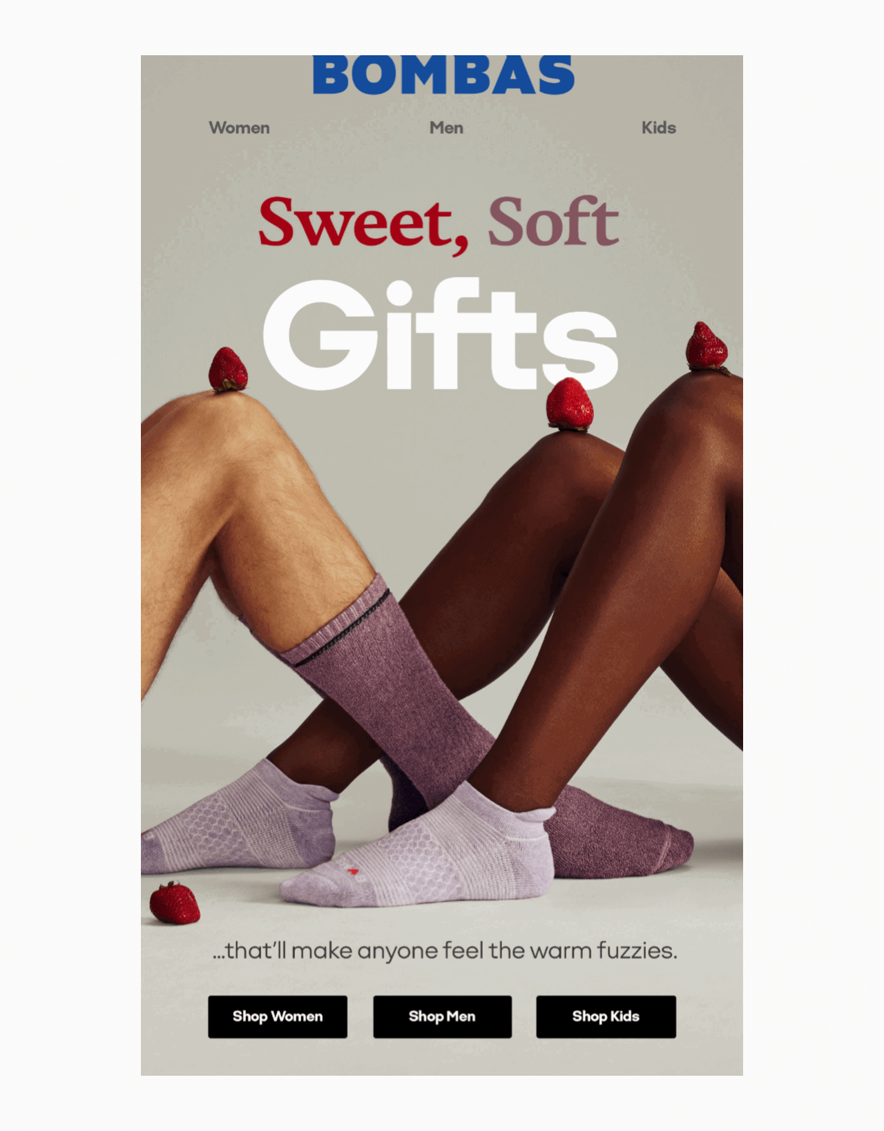 Finally, send one email dedicated specifically to your Valentine’s Day offers. For example, Bombas cleverly introduced its campaign by promoting socks as desirable gifts.