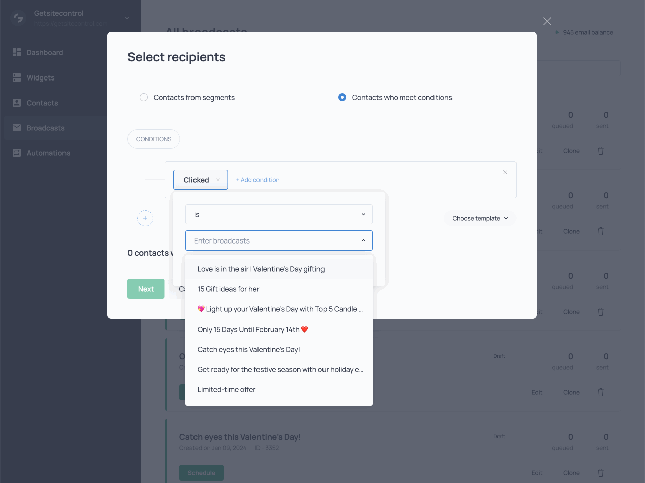 If you’ve never done it before, setting up a targeted promo campaign is easier than it sounds. Most email marketing apps allow you to do it when choosing campaign recipients. For example, in Getsitecontrol, you can select specific email link clicks as targeting conditions before sending your promo:
