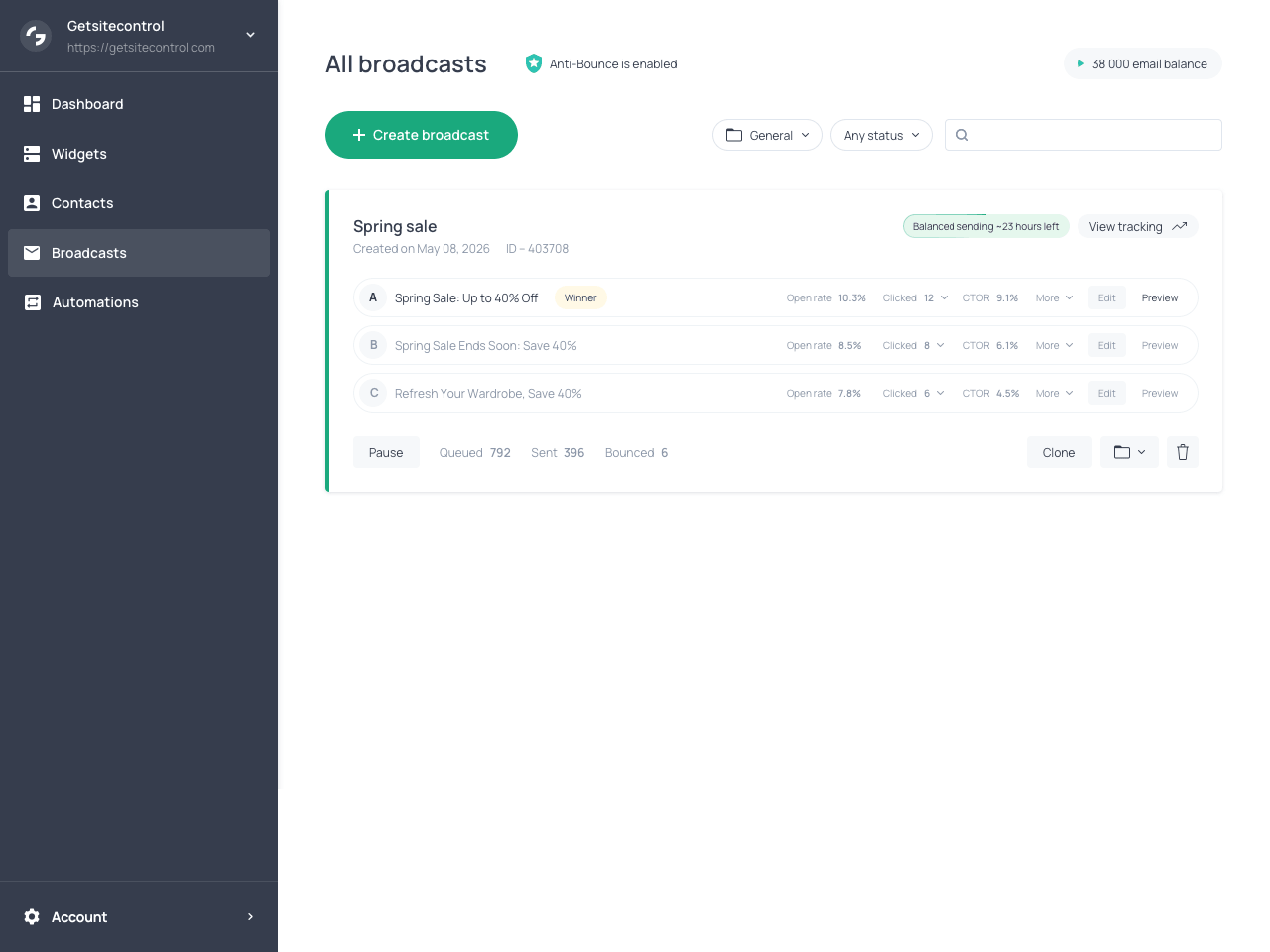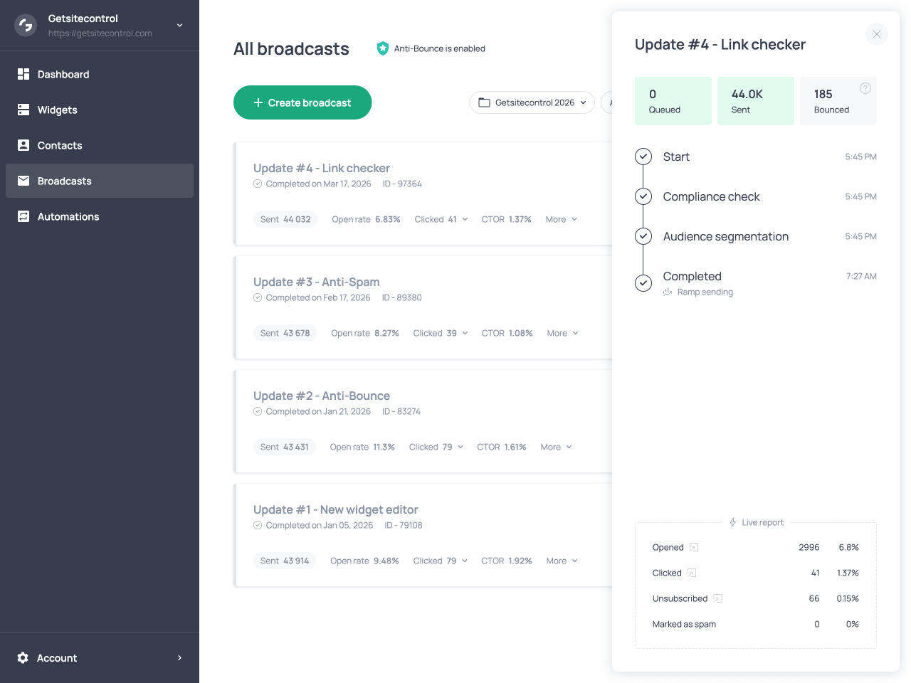 By filtering out invalid addresses before sending, Anti-Bounce keeps your bounce rate low or near zero. Since mailbox providers monitor bounce rates when evaluating sender reputation, maintaining a low bounce rate improves overall deliverability and ensures that your broadcasts reach the inbox.
