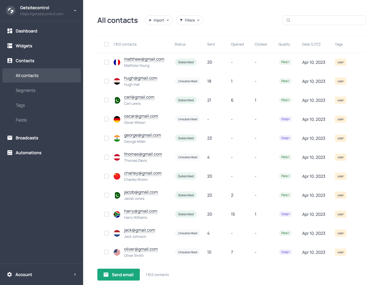 When you open Contacts in the left navigation, you see your full database. Each row displays the contact’s email address, marketing status (Subscribed, Unsubscribed, or Bounced), first and last name if collected, the date they were added, and any tags assigned to them. Additionally, you can see how many emails the contact received, opened, and clicked, and an indicator of the contact’s quality.