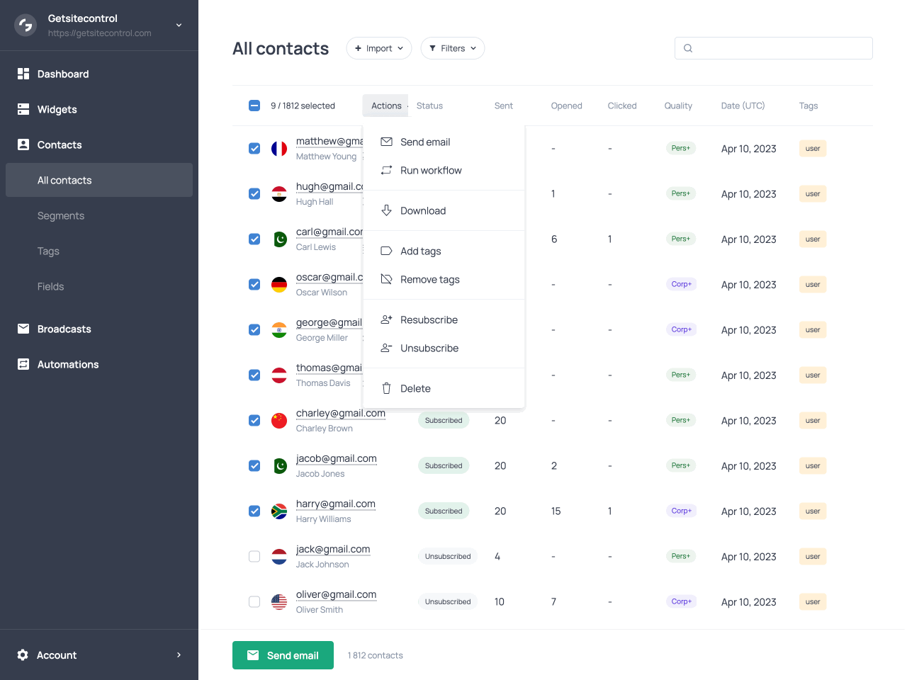 Select all the filtered contacts or a subset using the checkboxes on the left. This will reveal the Actions dropdown in the toolbar. From there, you can send an email broadcast, run a workflow, download the selected contacts as a CSV file, add or remove tags, resubscribe to your list, unsubscribe from your list, or delete the selected contacts.