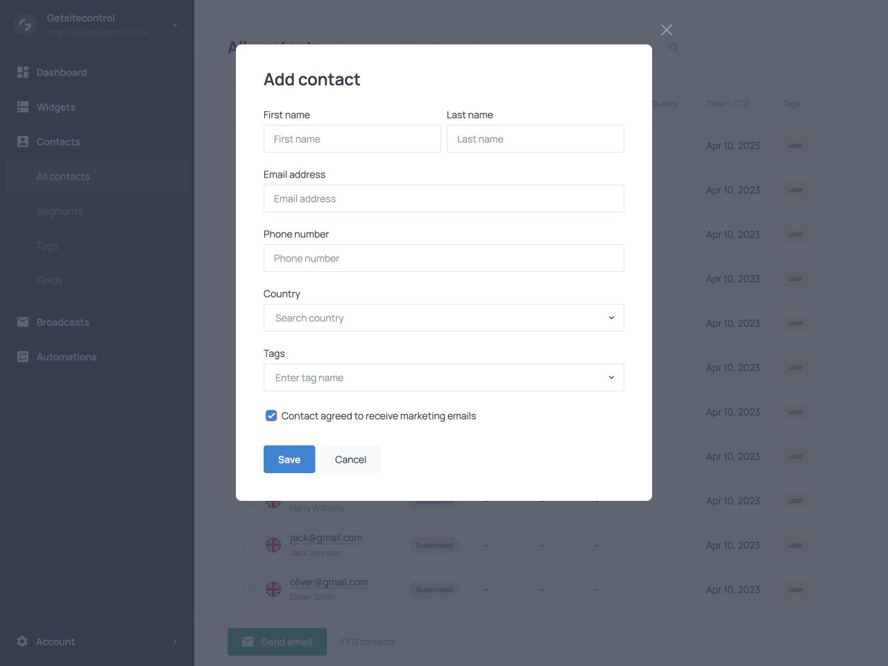 The Contacts section in Getsitecontrol is your central database. It includes all contacts who have submitted one of your forms or have been imported from an external source, and it gives you the tools to organize and manage them.