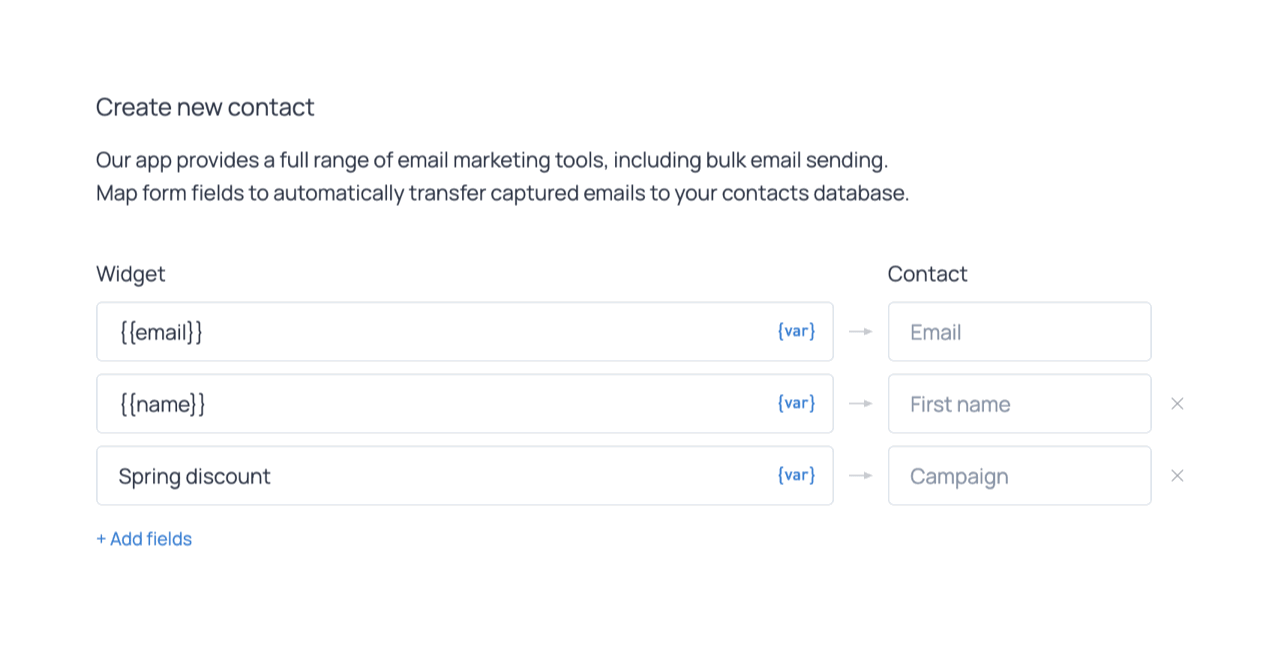 When working with forms, field mapping is configured in the widget editor under the Contacts tab. There, each form field is linked to a corresponding contact field. The section is initially empty, and you can add existing fields (default or custom) by clicking +Add fields. If you need to store new types of data, you can create a custom field directly from this interface. The new field becomes available immediately and can be used for future mappings, segmentation, and filtering.