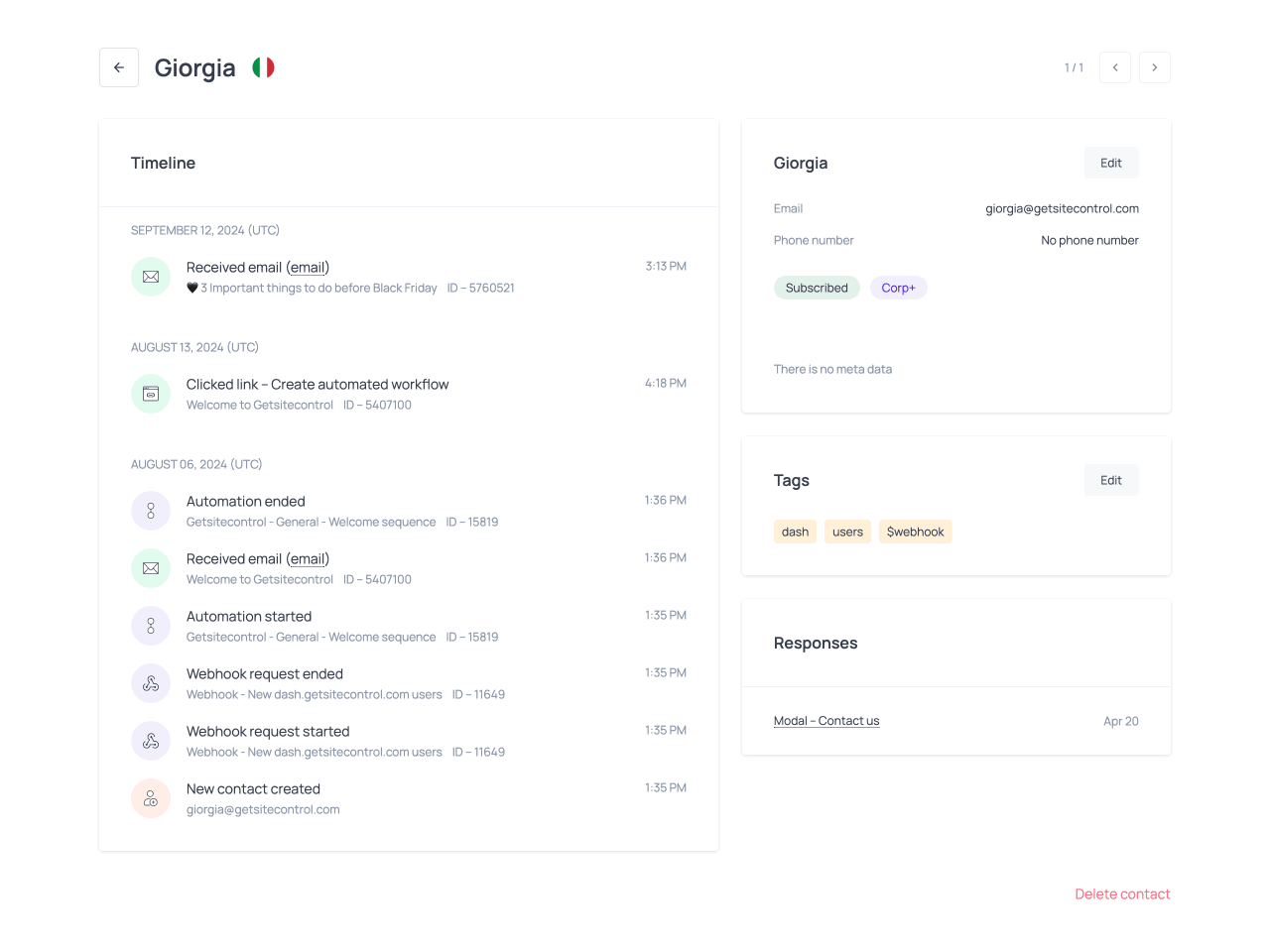The contact card brings all of this information together in one place. It shows the contact’s field values, assigned tags, and full interaction history, so you can understand how they joined your list and how they have engaged over time.