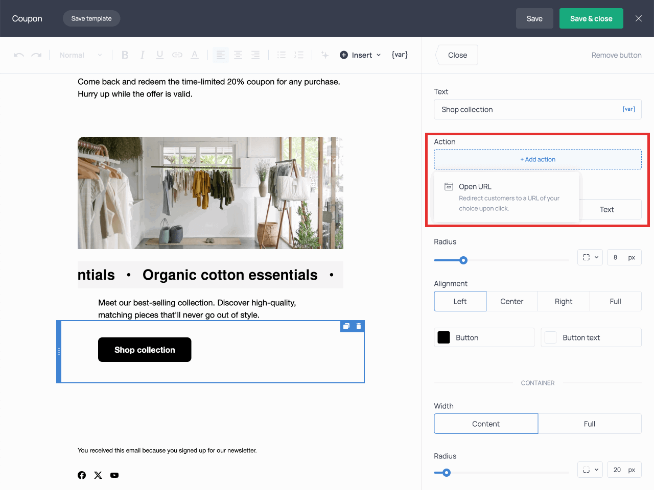 You can set up an Open URL action for clicks on CTA buttons and other email elements. When a recipient clicks on any of them, they’ll be redirected to a page of your choice.