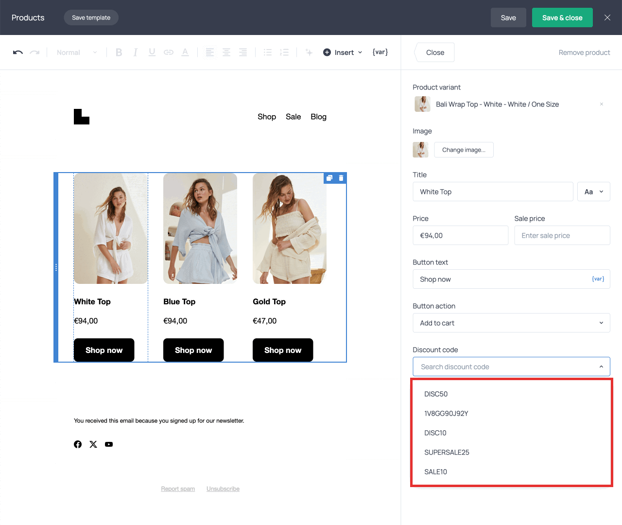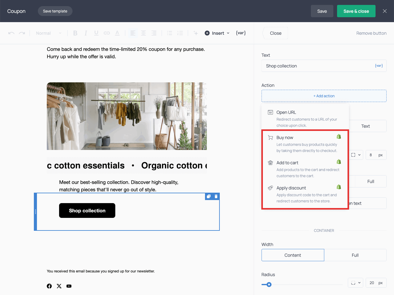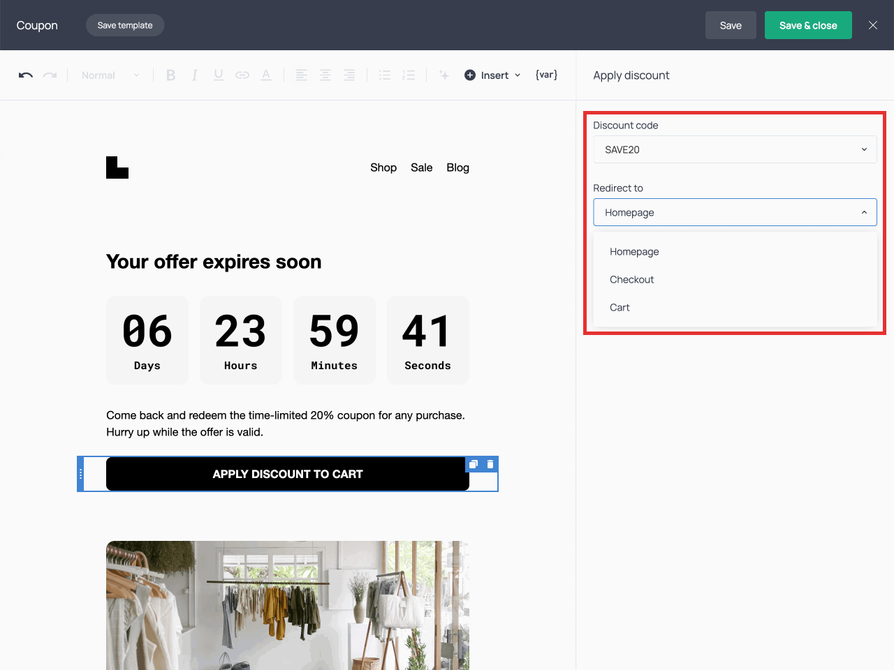Opt for Apply discount to directly apply a discount to your customers' shopping cart. Simply select the active discount code from your store and decide where you want to redirect your customers: to the homepage, cart page, or checkout.