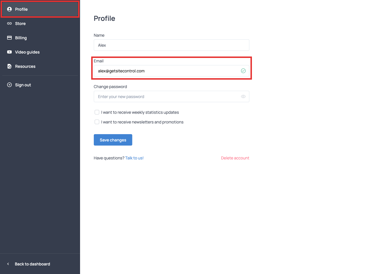 Your account email is the address you used to sign up for your Getsitecontrol account. Your invoices, weekly statistics updates, newsletters, and promotions are sent to this email.